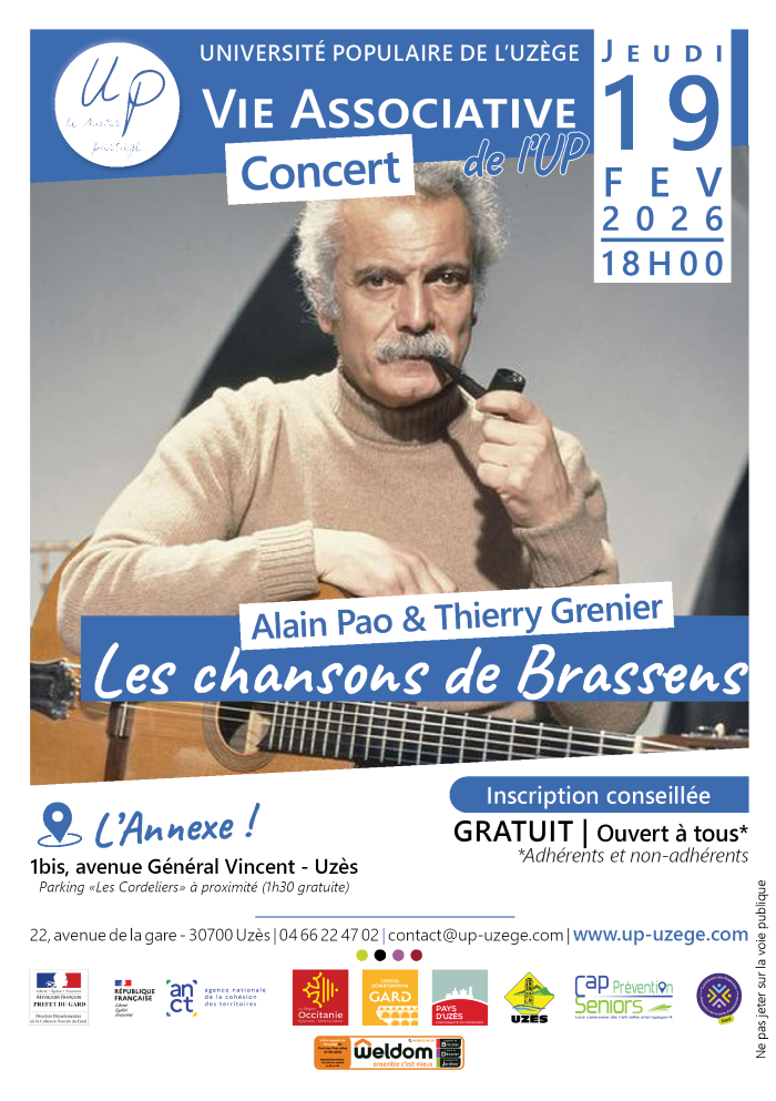 Dans ce concert, si le cœur vous en dit, vous entendrez des titres très connus mais aussi des chansons plus confidentielles, souvent aussi plus intimistes, que ne connaissent que ceux qui sont restés fidèles à cet auteur-compositeur-interprète qu’était Brassens..