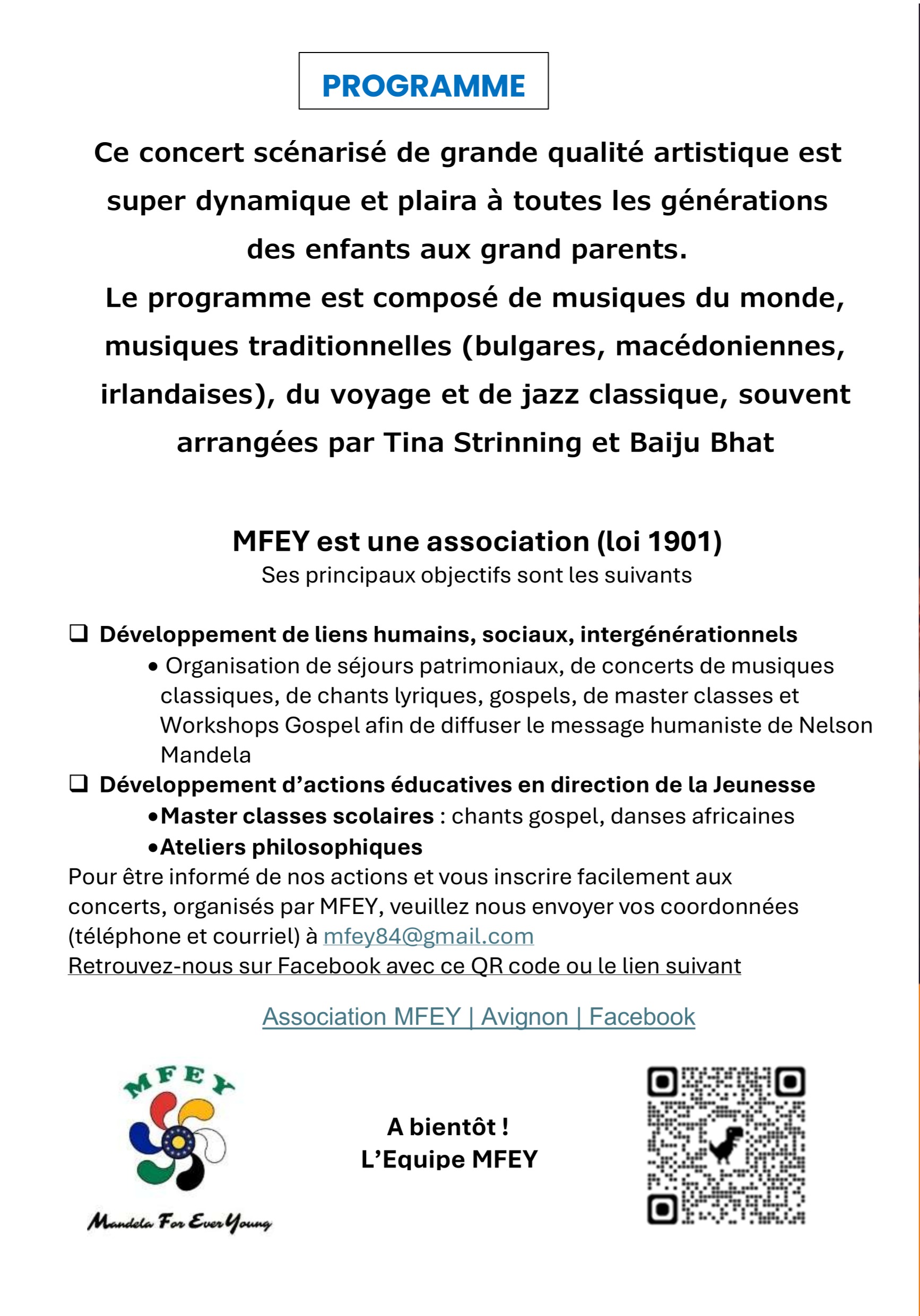 Ce concert scénarisé de grande qualité artistique est super dynamique et plaira à toutes les générations, des enfants aux grands-parents. Musiques du monde (bulgares, macédoniennes, irlandaises) musiques traditionnelles, du voyage et de jazz classique.