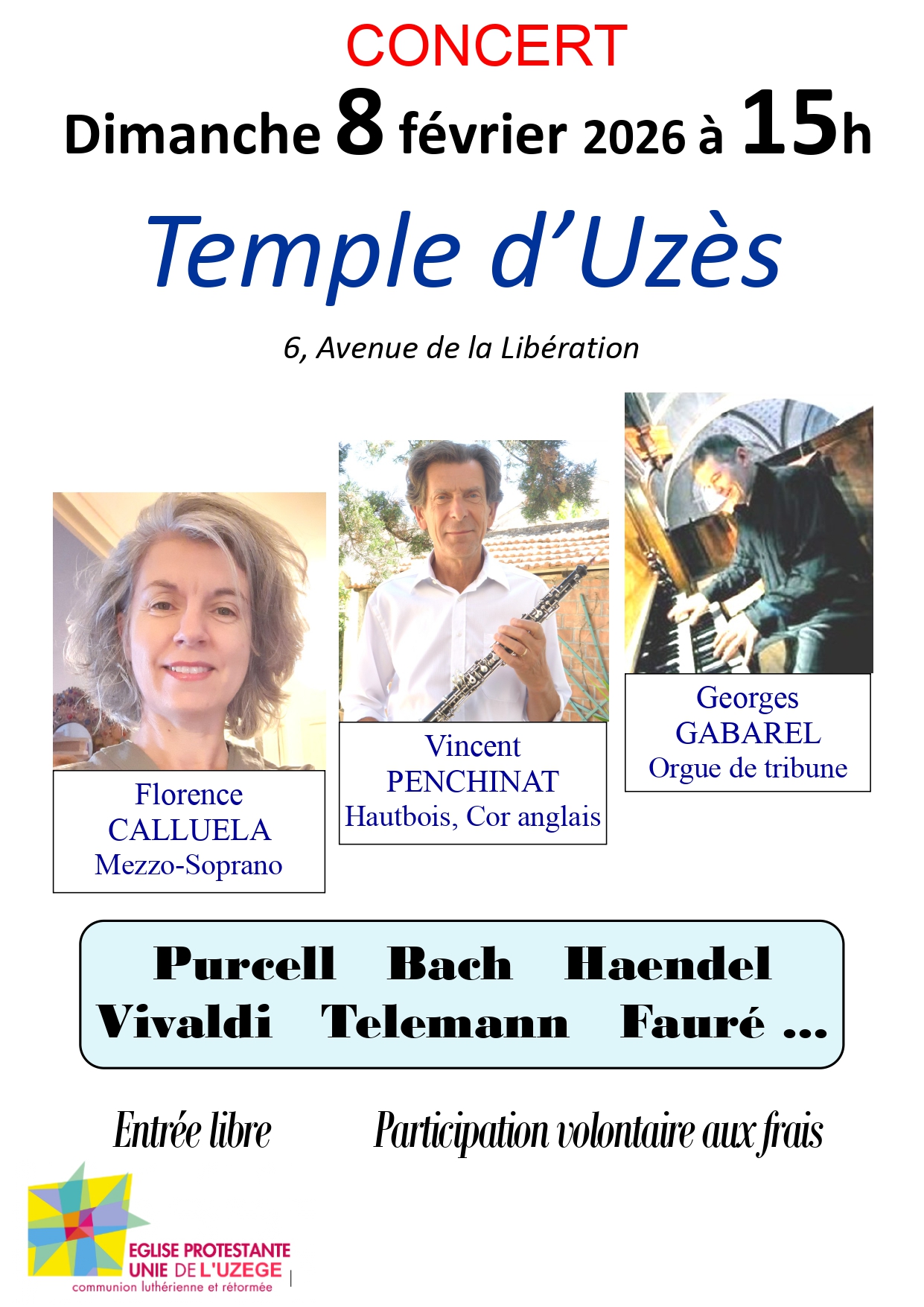 Le trio est composé de : Florence Calluela au chant soliste (mezzo-soprano), Vincent Penchinat au Hautbois (et Cor anglais), et Georges Gabarel (titulaire de l’orgue de l’Eglise Saint-Paul de Nîmes) à l’orgue de tribune du Temple d’Uzès.