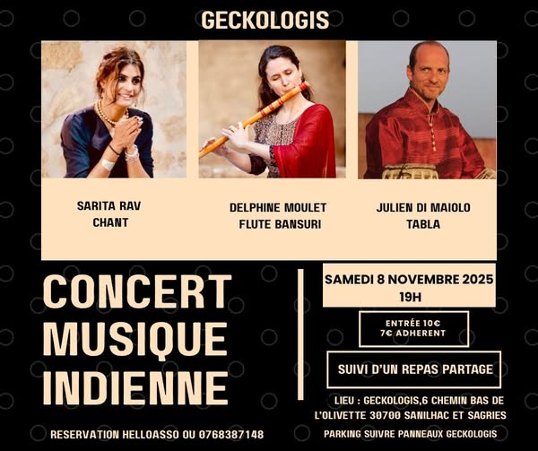 L’association Geckologis vous propose un concert de musique indienne avec Sarita Sav au chant ; Delphine Moulet à la Flûte Bansuri ; Julien Di Maiolo aux Tabla.Arès le concert, possibilité de repas : chacun.e amène un plat à partager.