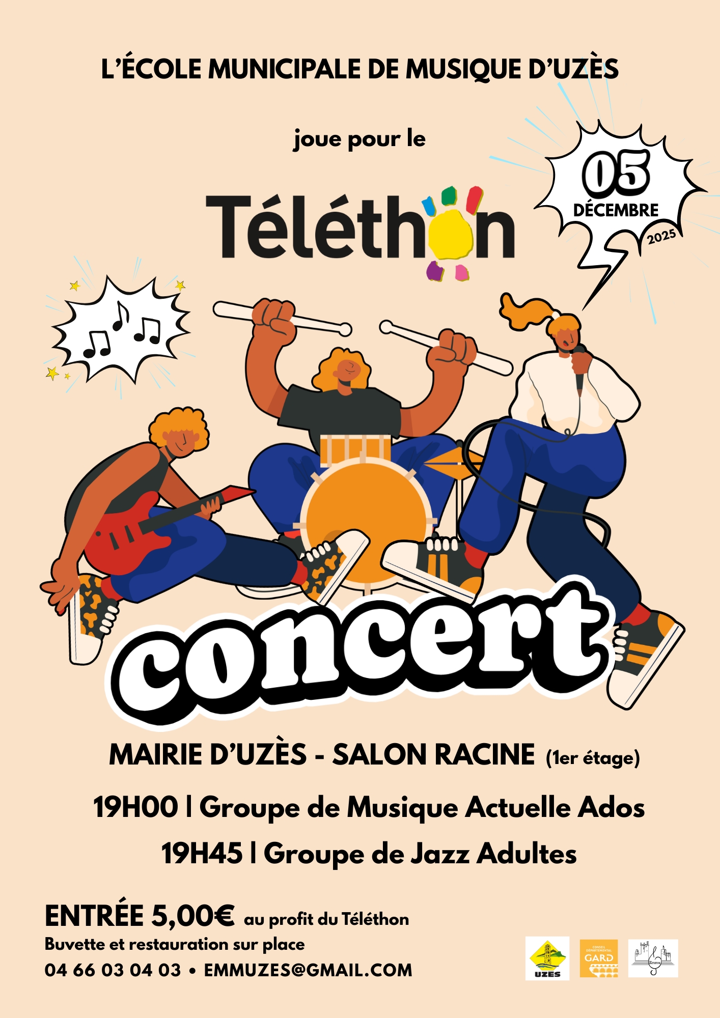À l’occasion du Téléthon, les groupes de Musique Actuelle Ados et de Jazz Adultes de l’École Municipale de Musique d’Uzès, donnent un concert. Venez nombreux et participer à aider la recherche contre les maladies génétiques !