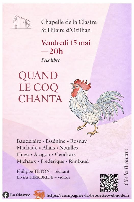La saison démarre à la Clastre avec de la poésie accompagnée au violon. Vous pourrez entendre du Baudelaire, Essénie, Rosnay, Machado, Allais, Noailles, Hugo, Aragon, Cendrars, Michaux, Frédérique, Rimbaud.