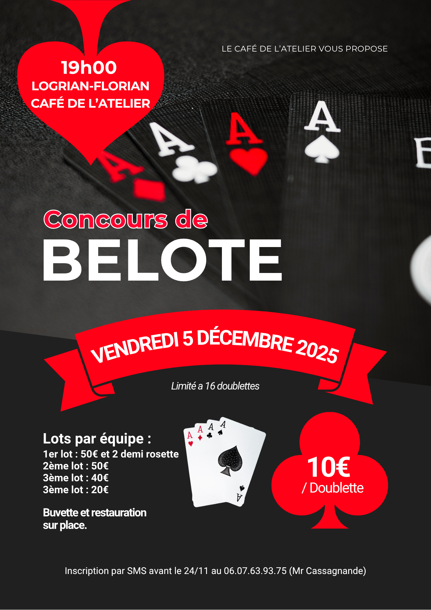 Concours de Belote au Café de l’atelier à Logrian-Florian Lots par équipe : 1er lot : 50€ et 2 demi rosette 2eme lot : 50€ 3eme lot : 40€ 3eme lot : 20€