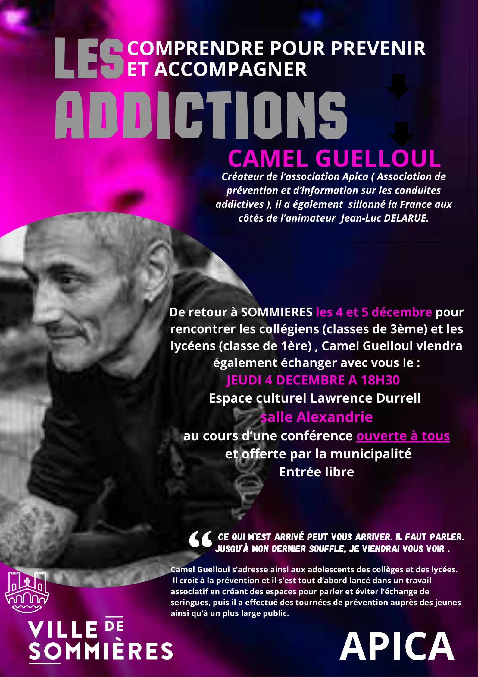 De retour à Sommières pour rencontrer les collégiens et les lycéens, Camel Guelloul viendra également échanger avec le public au cours d’une conférence ouverte à tous et offerte par la municipalité. Camel Guelloul croit à la prévention et il s’est tout d’abord lancé dans un travail associatif en créant des espaces pour parler et éviter l’échange de seringues, puis il a effectué des tournées de prévention auprès des jeunes, ainsi qu’à un plus large public.