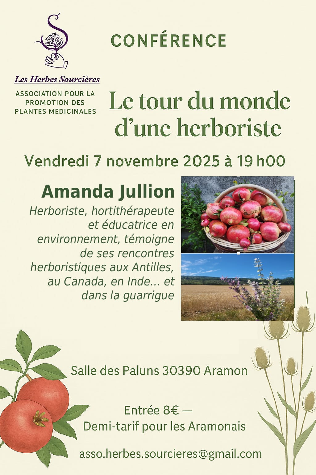 ** Vendredi 7 novembre à 19 h – Salle des Paluns, Aramon. Entrée 8 € — Demi-tarif pour les aramonais. Contact : asso.herbes.sourcieres@gmail.com.
