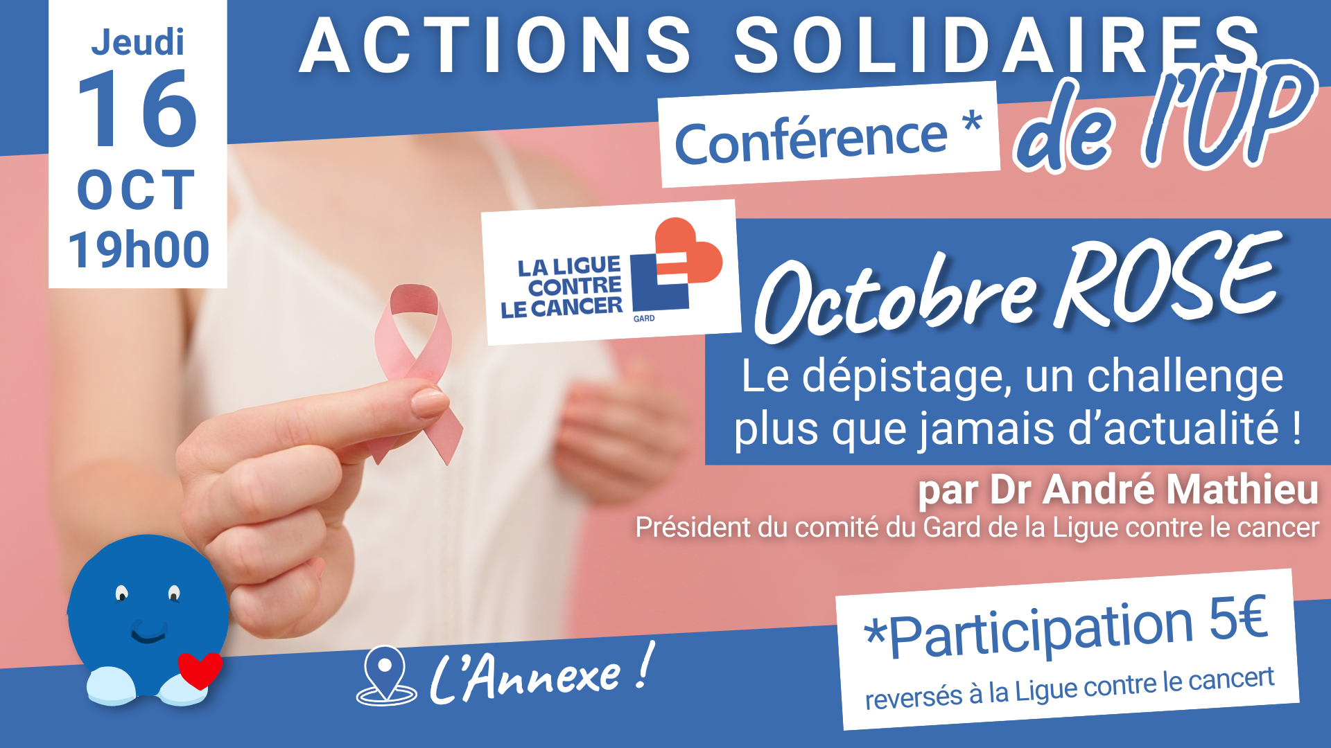 Dans le cadre de ses actions solidaires, l’Université Populaire invite le Dr Mathieu, président du comité du Gard de la Ligue contre le Cancer, pour une conférence. Elle s’intitule : « Octobre Rose : un challenge plus que jamais d’actualité ».