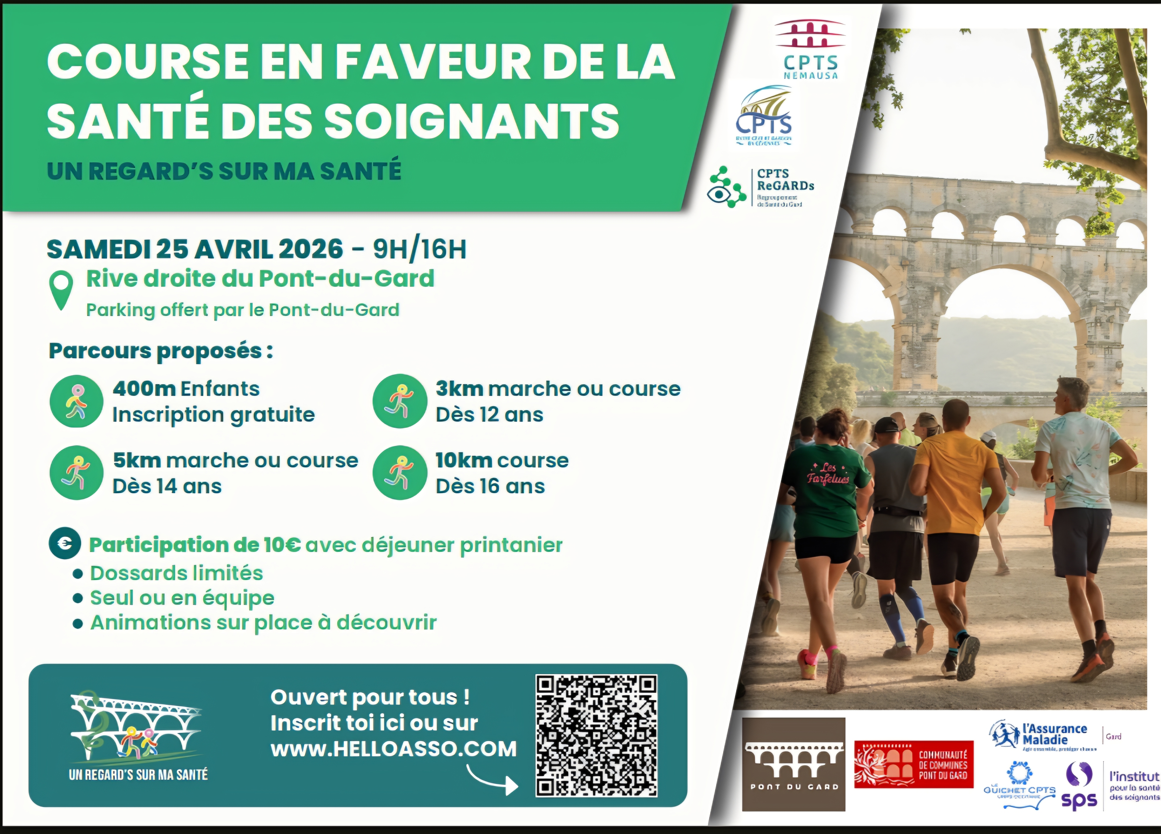 La Communauté Territoriale de Professionnel de Santé propose la 3ᵉ édition de la course associative au Pont du Gard « Un REGARDs Pour Ma Santé ».En faveur du dépistage, de la prévention et du bien-être psychologique des soignants.