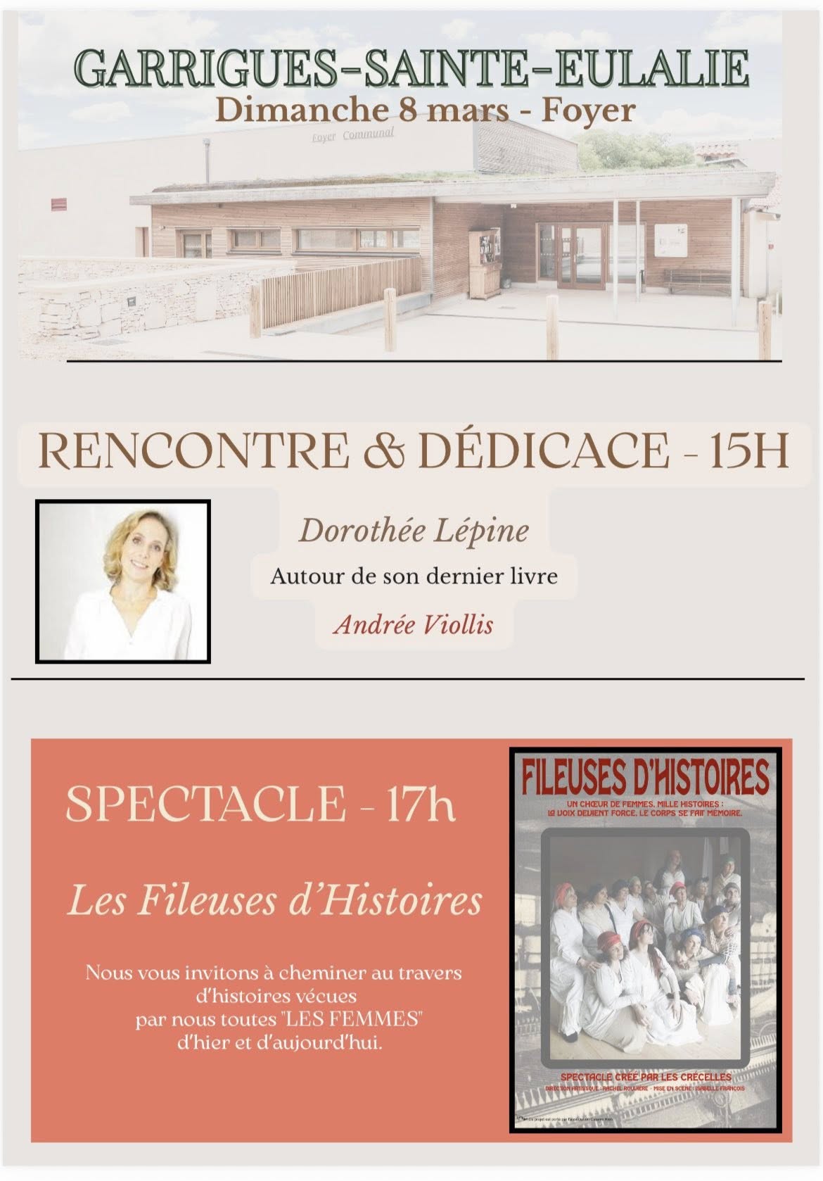 Dans le cadre de la journée des droits des femmes, la journaliste D. Lépine répondra aux questions de Michel Labro au sujet de sa bibliographie. Puis, elle dédicacera son livre. Les Crécelles présenteront ensuite leur spectacle.