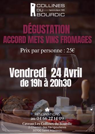 Un plateau de sept fromages sera à découvrir et à savourer, accompagnés par les cuvées des Collines de Bourdic préalablement choisies pour un accord parfait. À consommer avec modération. Places limitées : réservation obligatoire par téléphone.