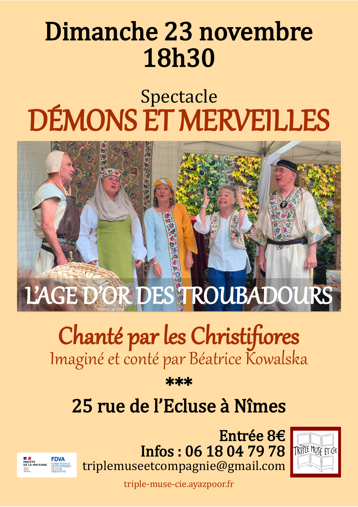 C’était un désir de reprendre le spectacle médiéval « DEMONS ET MERVEILLES » créé entre deux covids avec le groupe de chanteurs nîmois, « Les Christifiores ». Les chanteurs du groupe sont venus en Mayenne fin juillet pour une semaine de résidence, et deux représentations. Nous jouons en toute simplicité, « live », sans sonorisation , avec la lumière