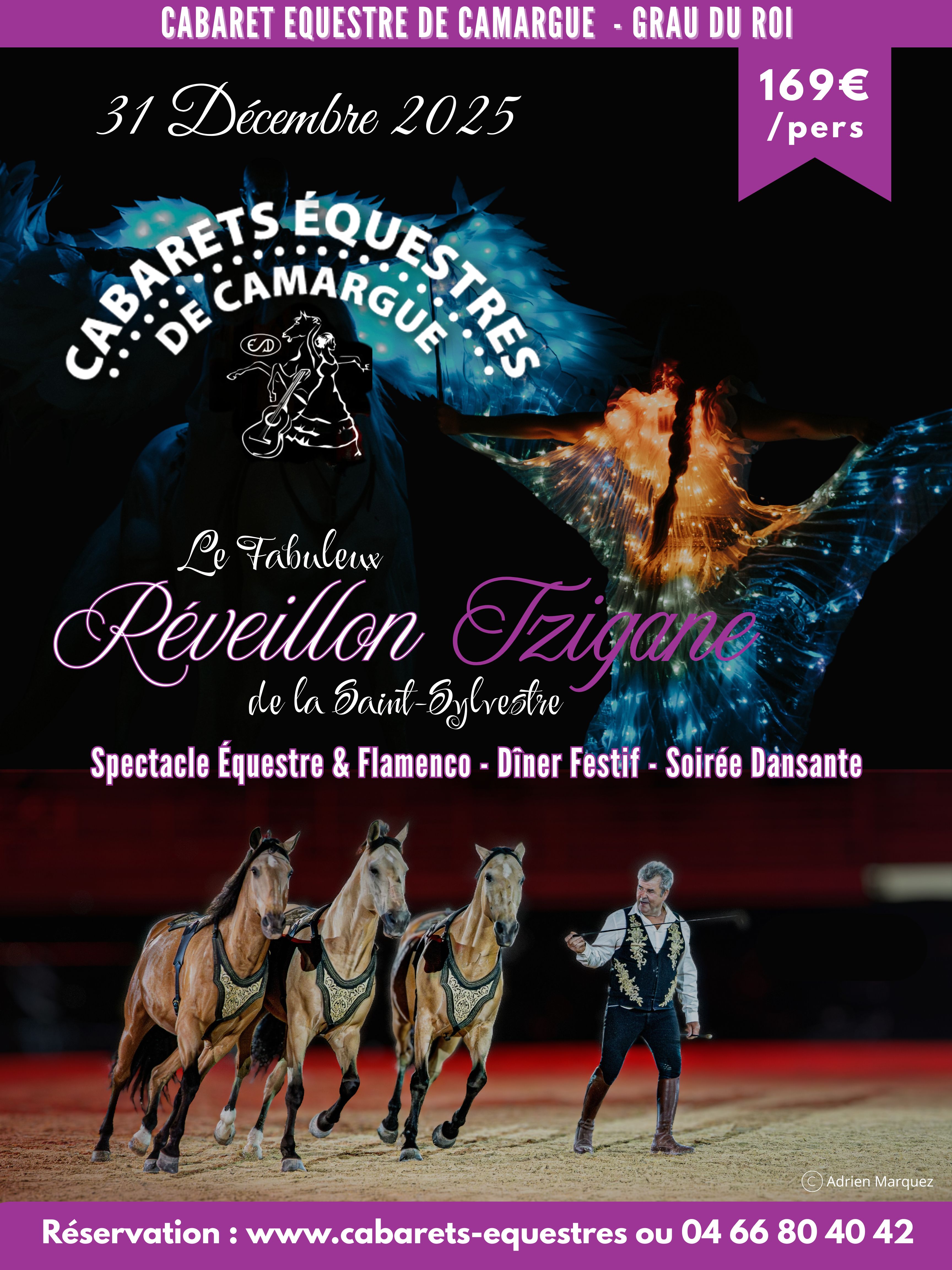 Amateurs de musiques gitanes, de danses flamenco et de cavalcades équestres. La troupe du Cabaret Equestre de Camargue vous prépare un spectacle inédit à l’occasion de cette belle soirée. Un spectacle pendant le repas où se glissent les prouesses de cavaliers, de voltigeurs, d’acrobates, d’écuyers tous envoûtés par les danseuses tziganes. Dressage, liberté, voltige … un son et lumière époustoufflant, pour une aventure équestre tout en poésie, ryhthmé par les guitares flamenca et danseuses gitanes. Venez prendre le large et passer ensemble à la nouvelle année.