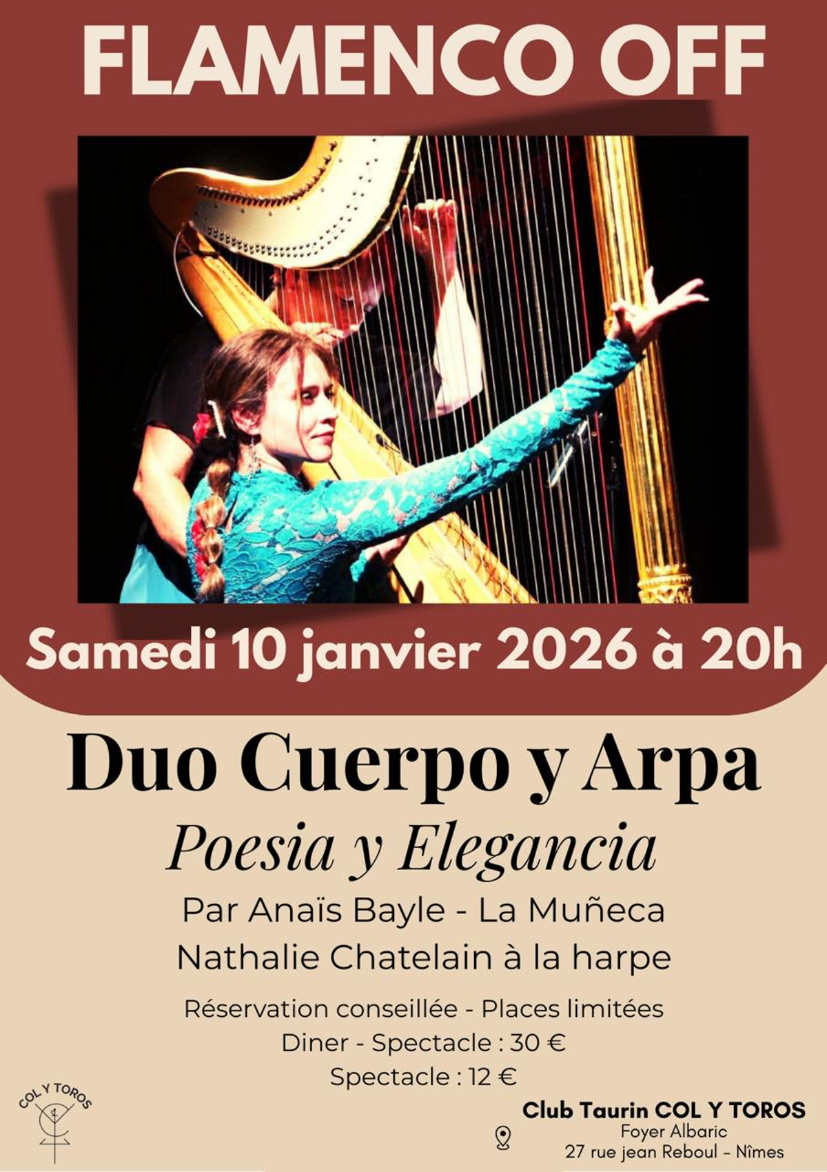 Duo Cuerpo y Arpa à 20h au Club taurin Col y Toros : poésie et élégance avec Anaïs Bayle et Nathalie Chatelain. Une soirée raffinée, avec possibilité de dîner, dans le cadre de Flamenco le Off.