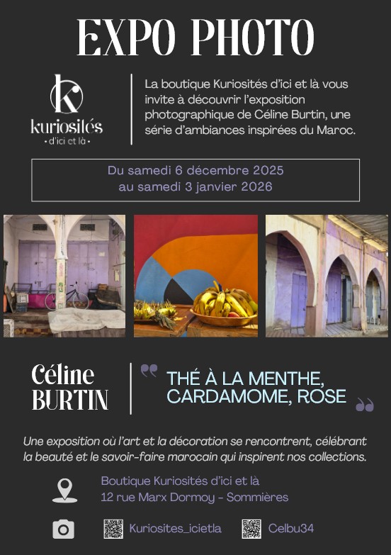 La Boutique Kuriosités d’ici et là se transforme en lieu d’accueil d’une exposition inédite de la photographe Céline Burtin : « Thé à la menthe, cardamome, rose ». Née d’une rencontre chaleureuse entre Florence, directrice de la boutique, et Céline, cliente de passage et photographe amatrice passionnée, cette expo est une ode au Maroc, ses couleurs, ses ambiances et sa poésie du quotidien.