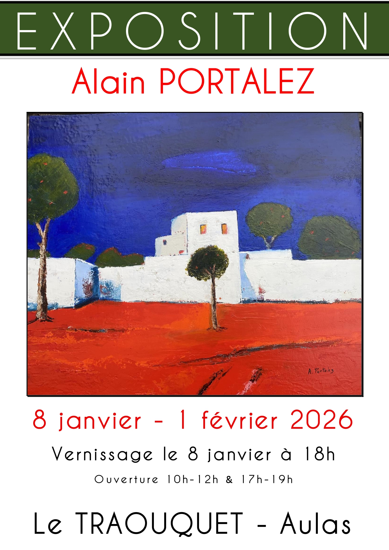Exposition de peinture : Alain Portalez, vernissage le 8 janvier à 18h.Visite de l’exposition voir horaire d’ouverture sur : https://www.autraouquet.fr/contact/