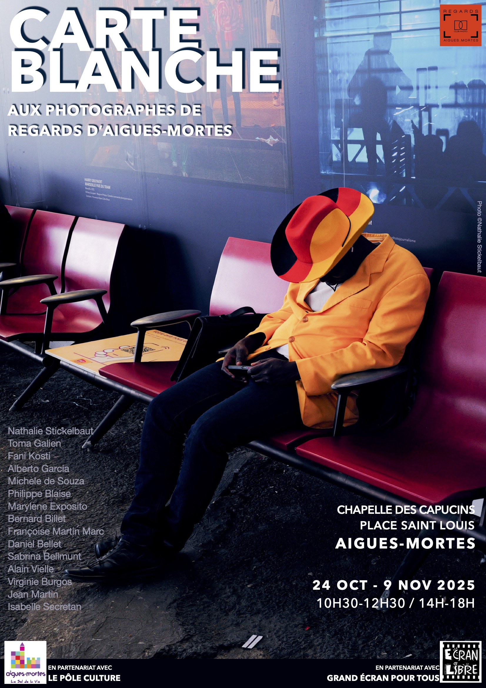 L’association de photographes Regards d’Aigues-Mortes vous invite à découvrir Carte Blanche 2025, une exposition collective réunissant : Nathalie Stickelbaut, Michèle de Souza, Toma Galien, Sabrina Bellmunt, Alberto Garcia, Fani Kosti, Philippe Blaise, Marylène Exposito, Bernard Billet, Françoise Martin Marc, Daniel Bellet, Alain Vielle, Virginie Burgos, Jean Martin et Isabelle Secretan.