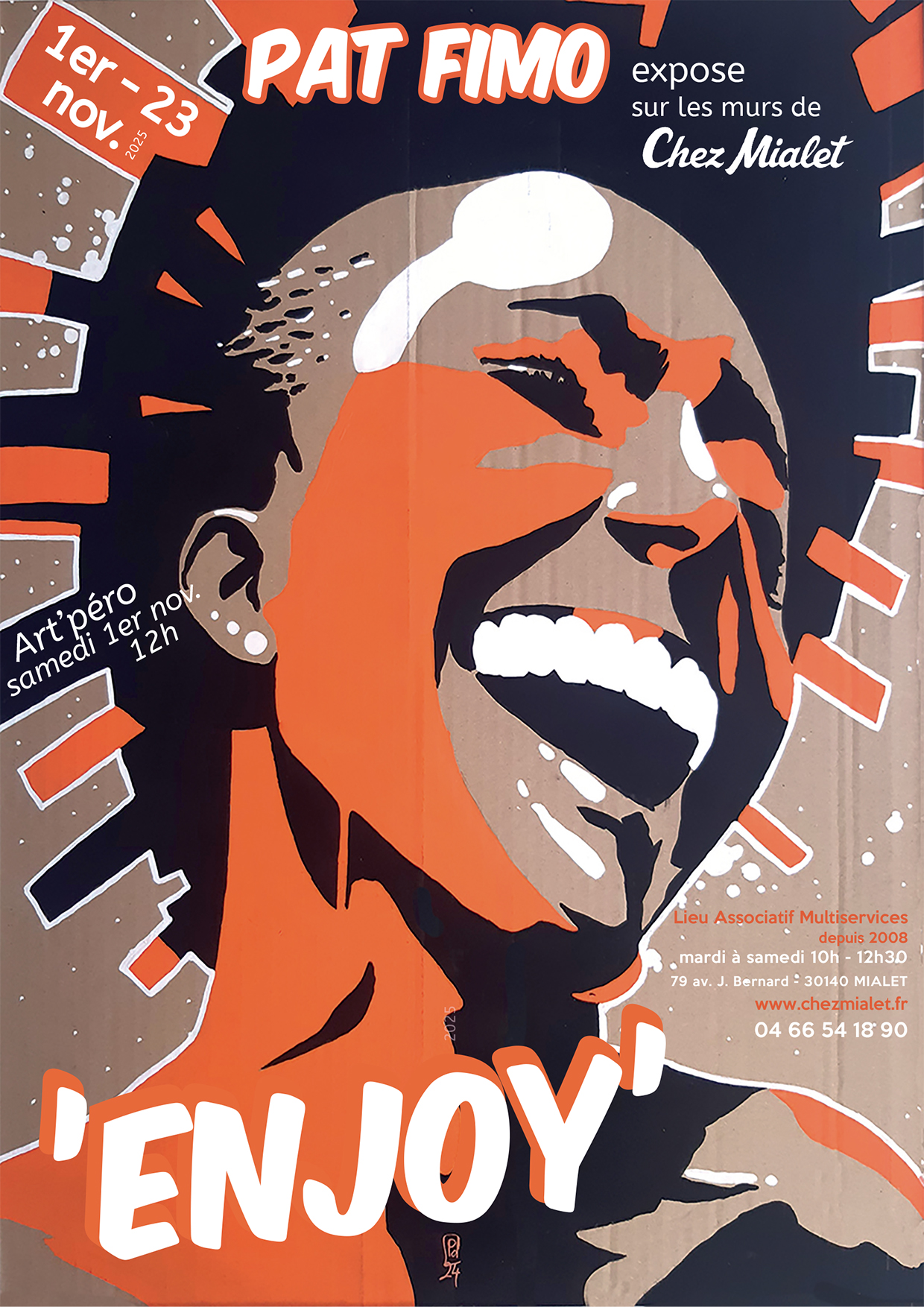 Nouvelle expo sur les murs de l’association Chez Mialet, l’artiste Pat Fimo nous propose avec ‘Enjoy’ (du 1er au 23 novembre 2025) une série de portraits tout en sourires magnifiant la magie et la force des expressions du visage.