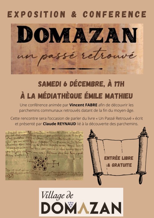 Une conférence animée par Vincent Fabre afin de découvrir les parchemins communaux retrouvés datant de la fin du Moyen Âge. Ce sera l’occasion de parler du livre « Un Passé Retrouvé », écrit et présenté par Claude Reynaud, lié à cette découverte.