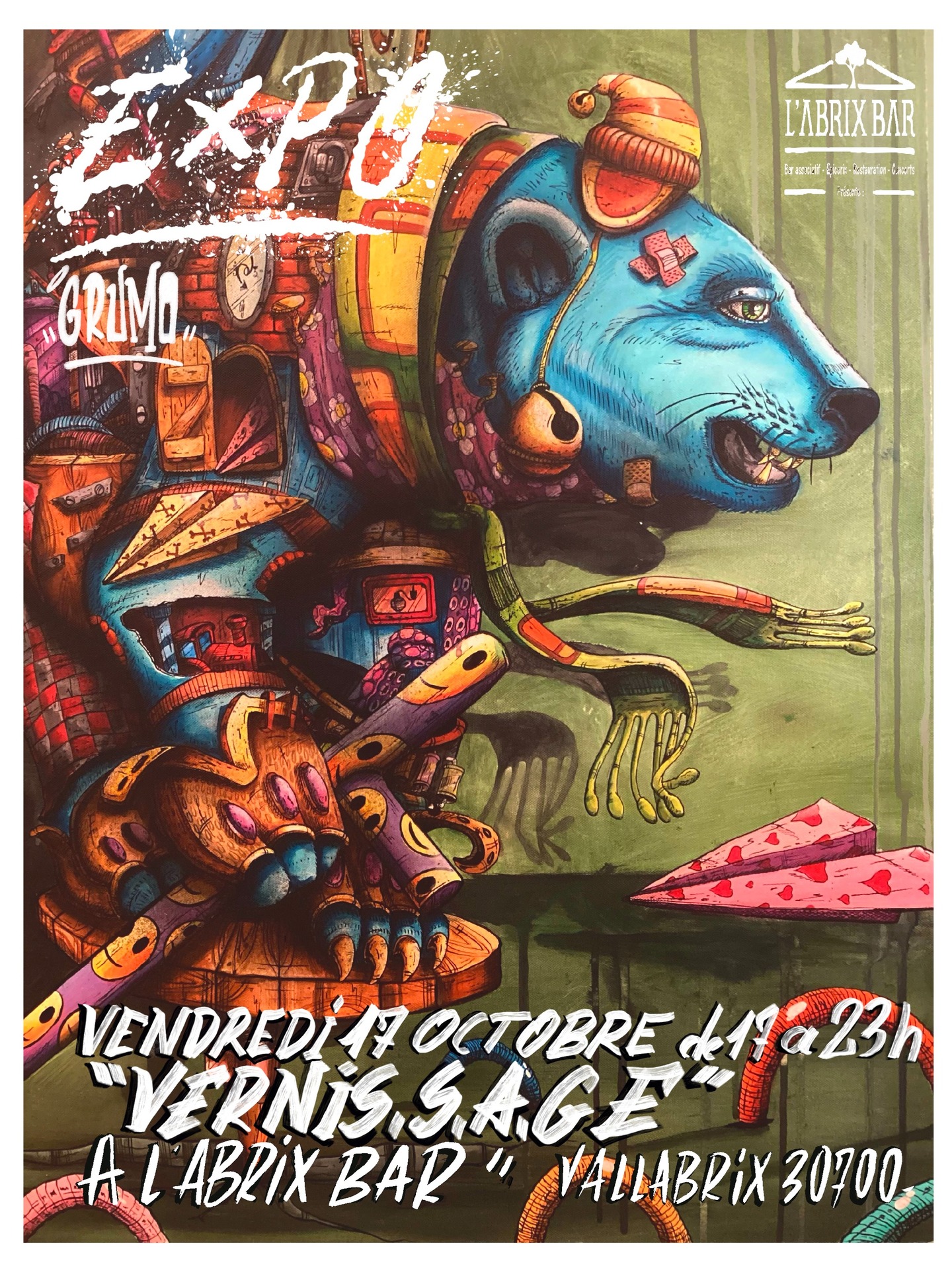 L’Abrix bar abrite l’exposition de l’artiste de street art Grumo, également tatoueur et graffeur. Ses thèmes de prédilection : les animaux, la mécanisation extrême de l’environnement, et l’individu qui s’y insère malgré lui.