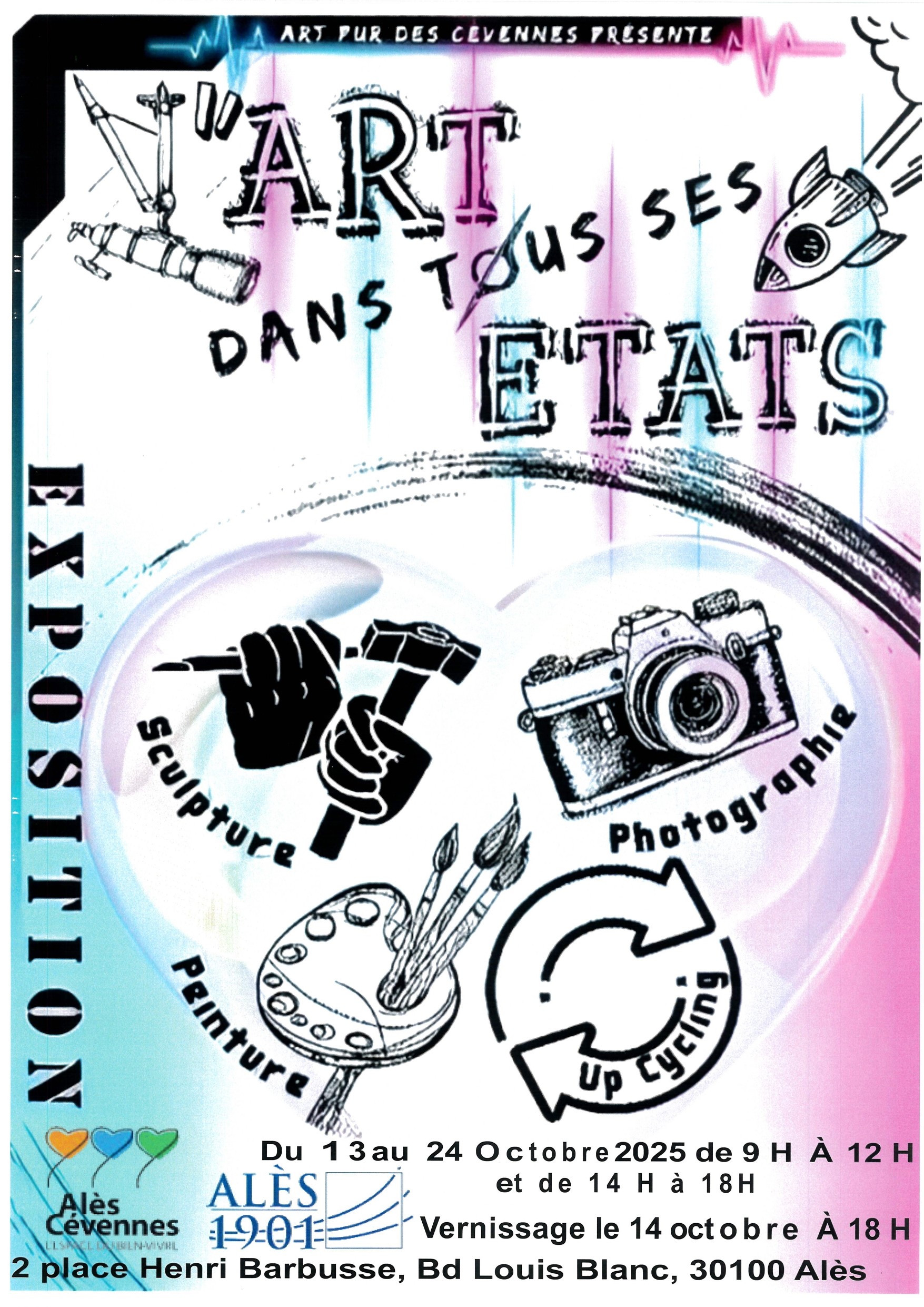 L’Espace André Chamson vous invite à une exposition présentant des oeuvres photos, sculptures ou peintures.Vernissage le 14 octobre à 18h.