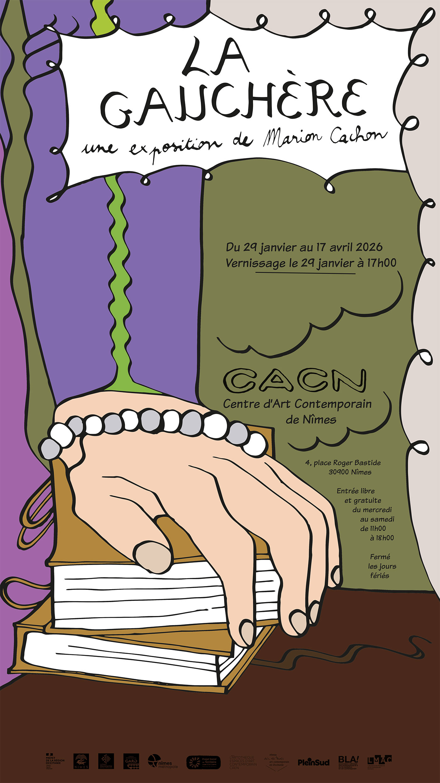 Graphiste de formation, Marion Cachon développe une pratique qui articule recherche théorique et expérimentation formelle. L’exposition présentera notamment les planches typographiques de la calligraphie gauchère qu’elle a développée, ainsi qu’un ensemble d’affiches réalisées en 2025 pour les expositions du CACN, dont elle signe l’identité visuelle actuelle. L’exposition fera volontairement place aux écarts et aux processus : affiches non retenues, essais, variantes et formes inabouties y seront montrés comme des éléments constitutifs du travail, en lien direct avec le contexte du centre d’art.