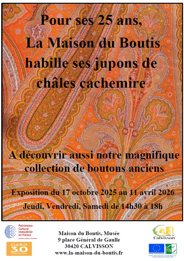 Pour fêter ses 25 ans, la Maison du Boutis présente un ensemble de châles cachemire du XIXe siècle, tissés en laine et cachemire. Ces châles, portés l’hiver par les femmes, ont connu un grand succès tout au long du XIX siècle. L’industrie textile de Nîmes , qui était un des centres principaux de fabrication en France, en a produit et exporté dans toute l’Europe.
