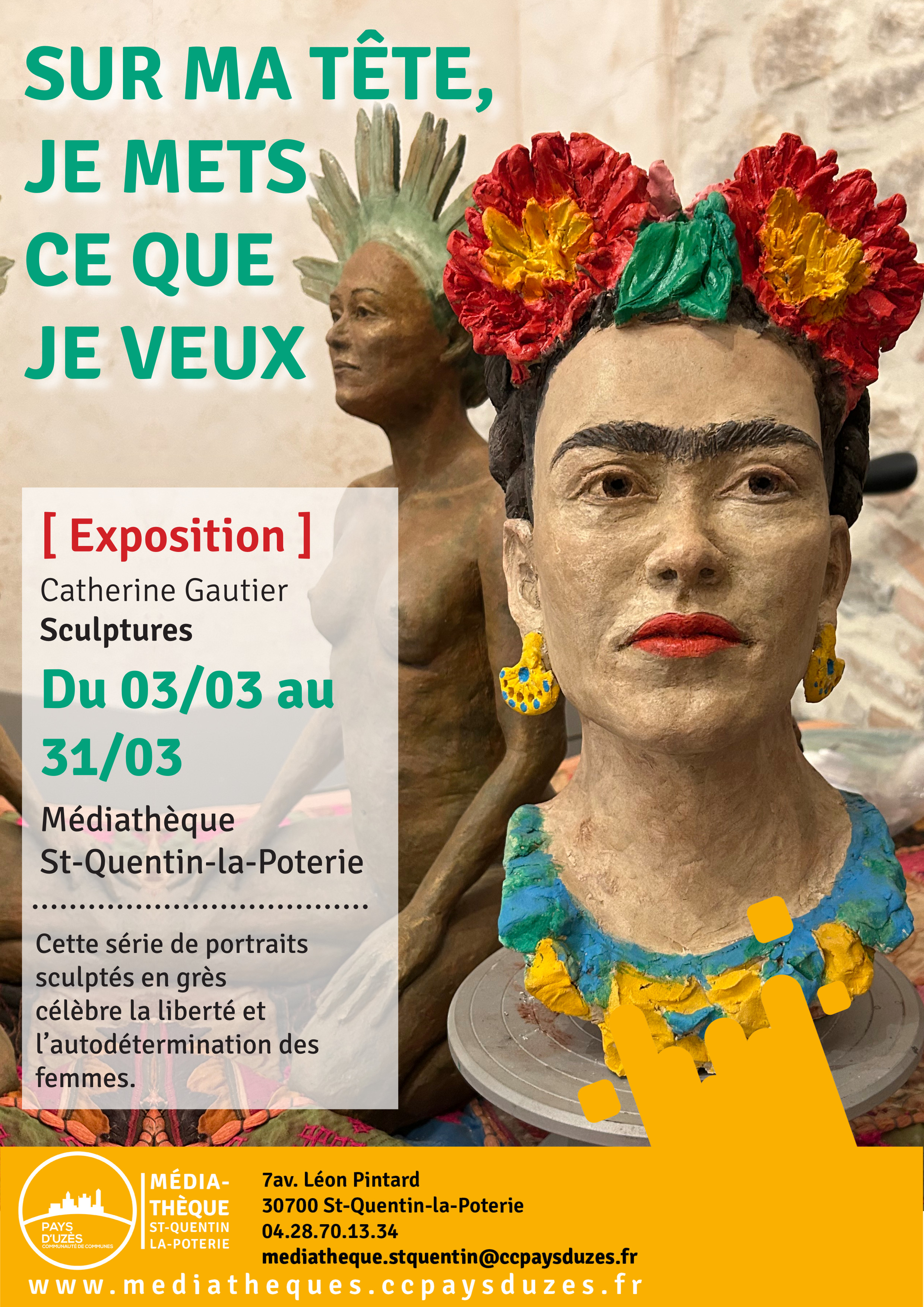 La médiathèque vous propose une exposition de sculptures de Catherine Gautier, « Sur ma tête, je mets ce que je veux ». Cette série de portraits sculptés en grès célèbre la liberté et l’autodétermination des femmes.