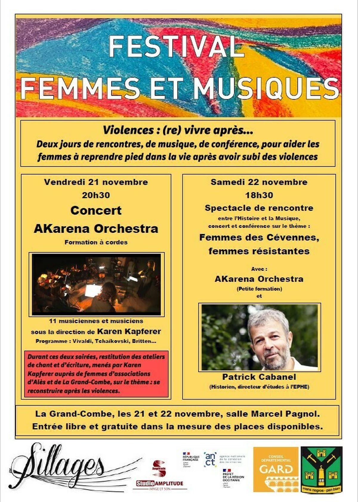 Autre particularité, une première, toujours dans l’idée de la rencontre entre des mondes qui se croisent peu: un concert conférence qui verra dialoguer l’historien Patrick Cabanel et le AKarena Orchestra sur le thème: Femmes des Cévennes, femmes résistantes.