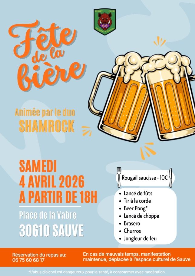 Fête de la bière à Sauve le samedi 4 avril 2026 à partir de 18h place de la Vabre. Organisée par le Rugby Club Piémont Cévenol.Soirée animée par le duo Shamrock