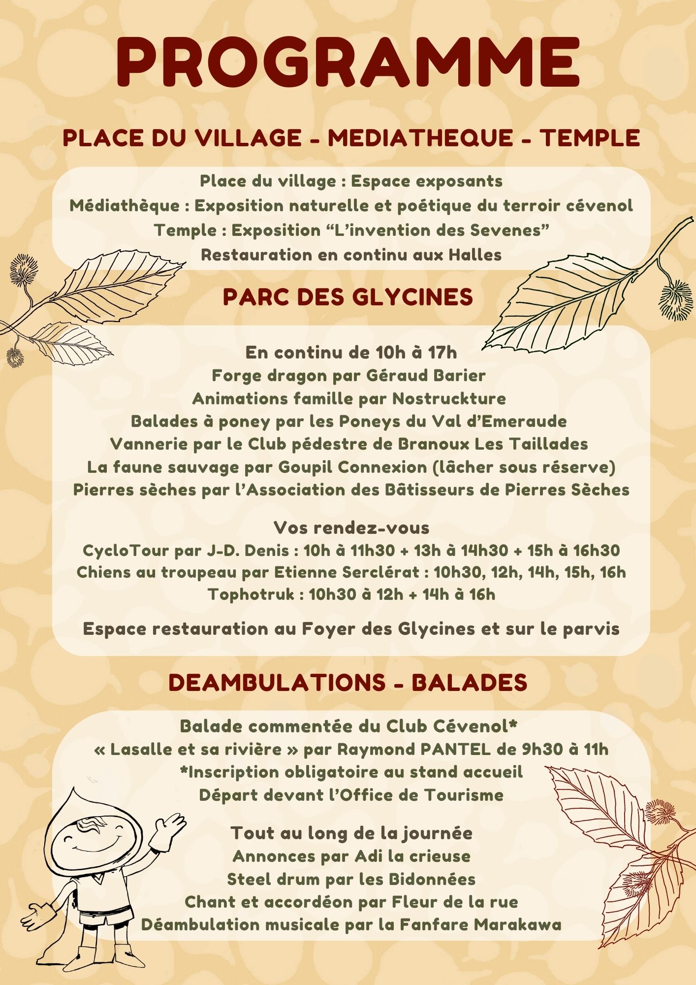 La Fête de la Châtaigne à Lasalle revient pour la 27ème édition! Un rassemblement où saveurs régionales et folklore se rencontrent pour célébrer les trésors du terroir. Marché de producteurs, animations, artisanat, foodtrucks… Une expérience unique !
