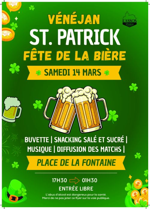 Vous êtes prêts ? La Saint-Patrick revient à Vénéjan, une soirée organisée par l’Assos.… et on vous prépare quelque chose de… très festif !Ambiance, musique, snack….