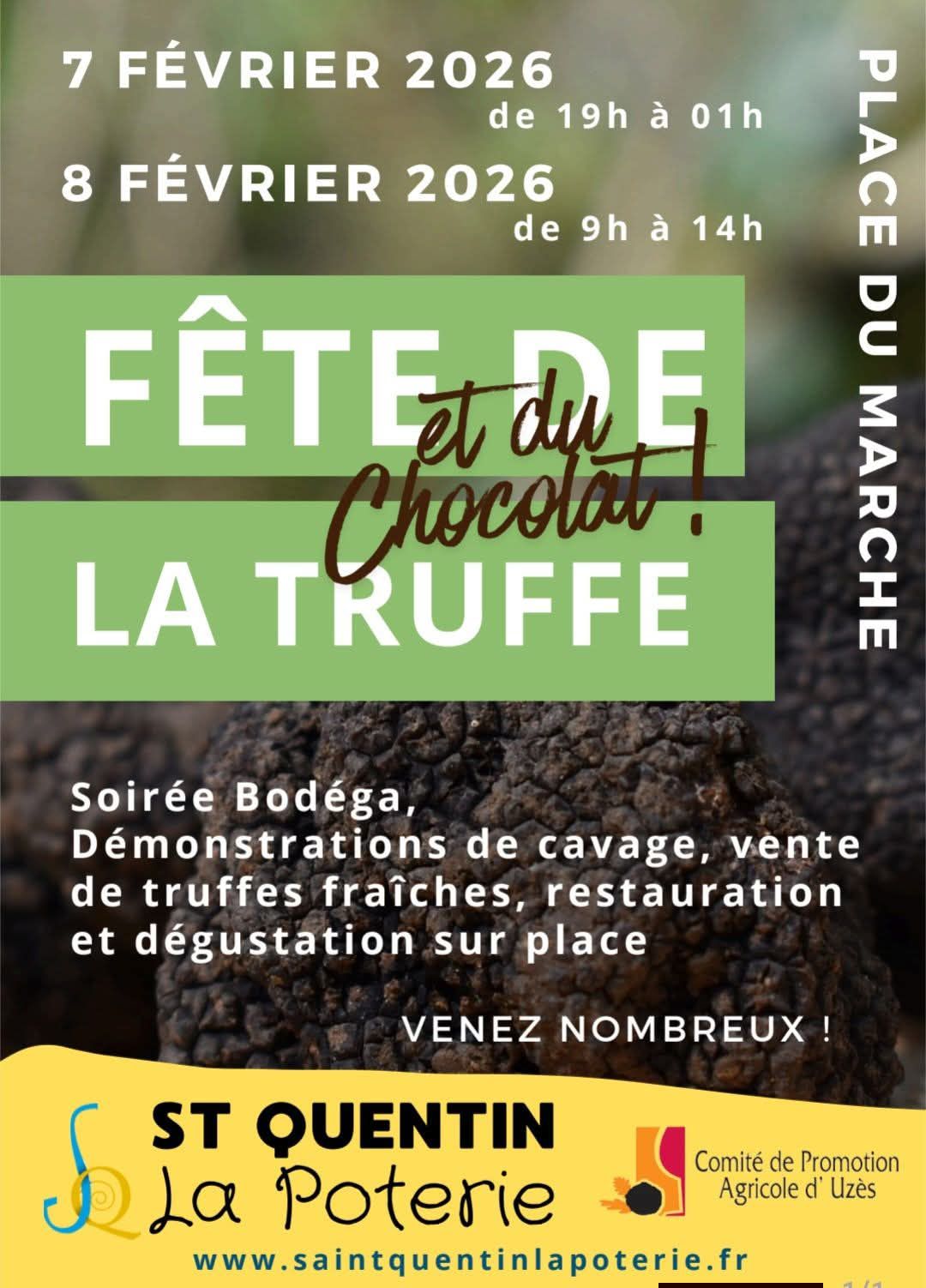 Dans le cadre de la « Saison de la truffe », la Mairie de St Quentin la Poterie vous propose, en partenariat avec Le Comité de Promotion Agricole d’Uzès, en lien avec le Syndicat des Producteurs de Truffes du Gard, un week-end spécial « FÊTE DE LA TRUFFE » les samedi 7 et dimanche 8 février 2026.
