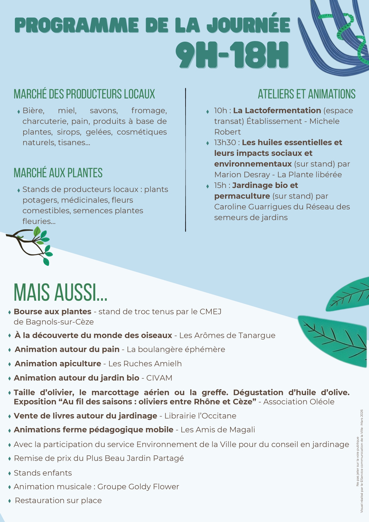 Un programme riche en découvertes – Marché aux plantes et aux produits locaux – Ateliers et animations pour petits et grands – Conférences et sensibilisation Découvrez des sujets passionnants autour de la biodiversité, du compostage, des bienfaits des huiles essentielles ou encore des techniques de taille d’oliviers et de jardinage écologique.