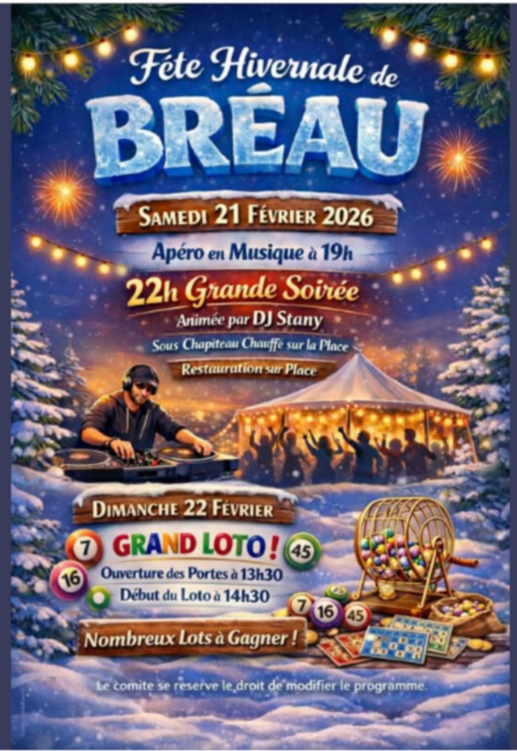 Fêtardes et fêtards, le Comité des fêtes de Bréau vous donne rendez-vous pour une nouvelle édition de sa fête hivernale… et ça promet d’être chaud Au programme : Le Samedi 21 février, le comité vous attend surmotivés avec : Apéritif en musique dès 19h pour bien démarrer la soirée Grande soirée animée par DJ Stany à partir de 22h Et ce n’est pas fini ! Dimanche 22 février : place au GRAND LOTO du comité pour tenter de gagner de nombreux lots dans une ambiance conviviale Cette année marque également le retour du chapiteau chauffé On vous attend nombreux, surmotivés et prêts à faire la fête !