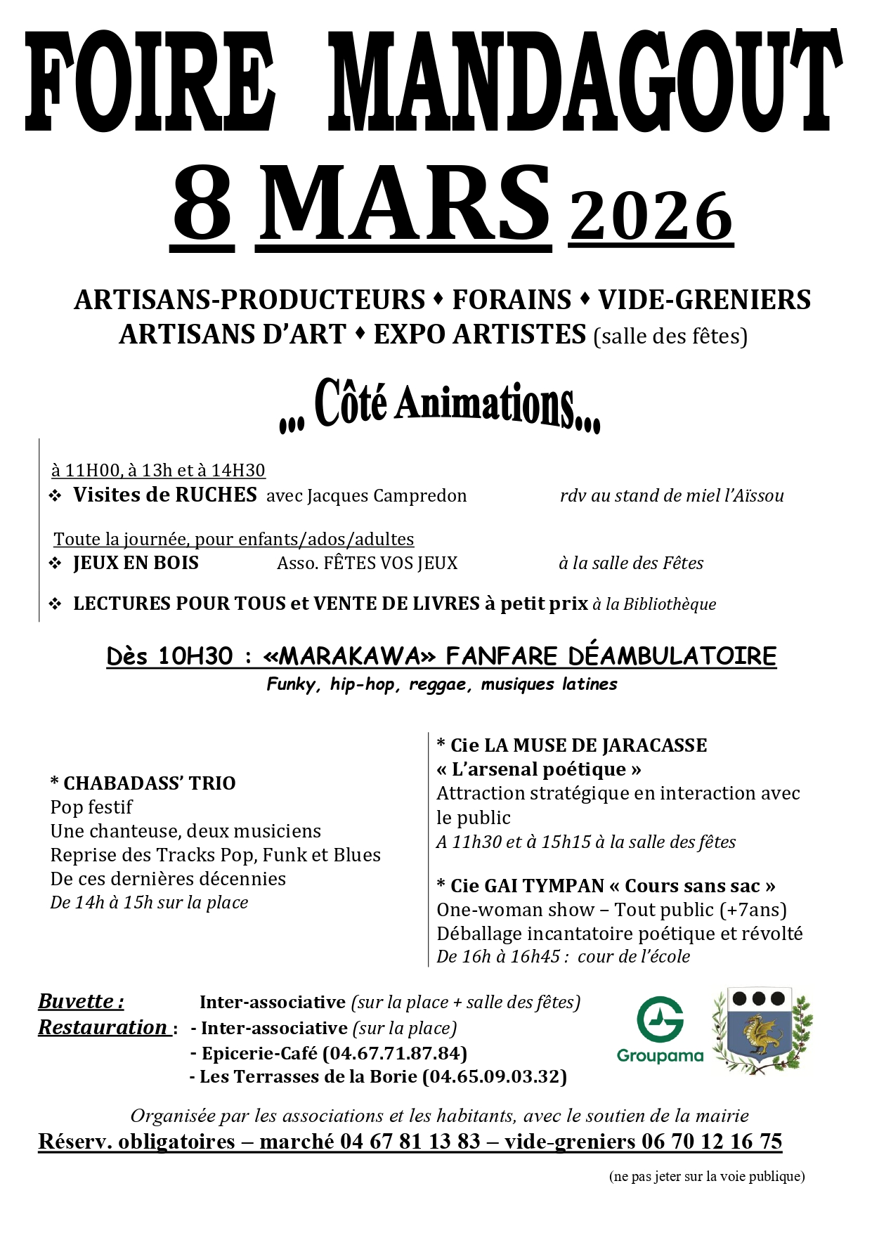 GRANDE FOIRE annuelle de MANDAGOUT DIMANCHE 8 MARS 2026 Artisans -Producteurs -Commerçants -Vide-greniers -Artisans d’art -Expo Artistes Diverses animations toute la journée, jeux, spectacles, musique Buvette et Restauration toute la journée Contact : mairie de Mandagout 04 67 81 13 83