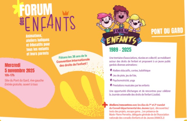 En avant-première de la Semaine gardoise des droits de l’enfant, le Pont du Gard accueille le Forum des enfants avec de nombreuses animations pour les enfants : jeux de piste, prestations musicales, ateliers éducatifs, contes et autres réjouissances.