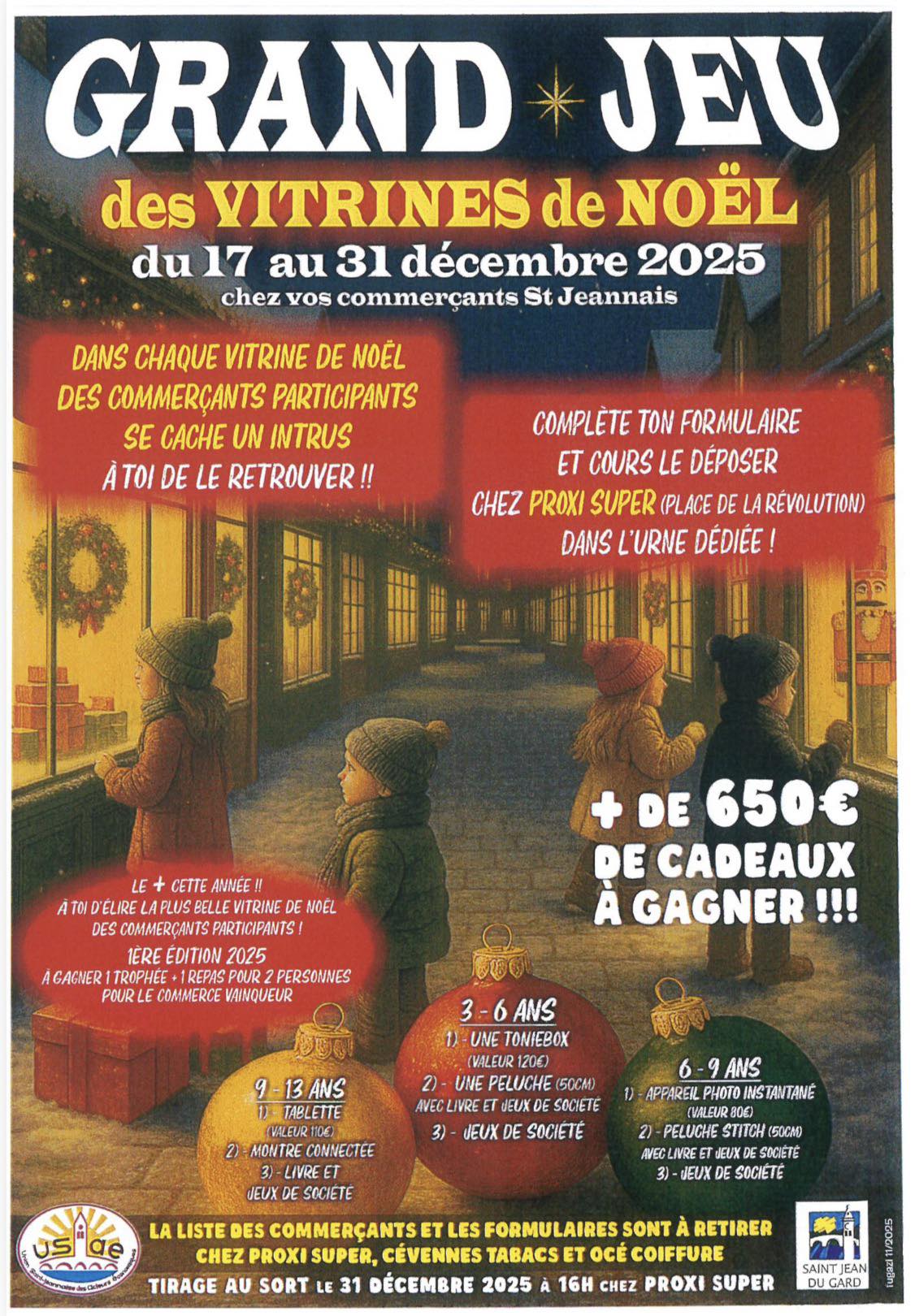 Complète ton formulaire et cours le déposer chez Proxi Super, place de la révolution, dans l’urne dédiée ! De plus cette année, à toi d’élire la plus belle vitrine de Noël des commerçants participants. La liste des commerçants participants et les formulaires sont à retirer chez Proxi Super, Cévennes Tabacs et Océ Coiffure Tirage au sort le 31 décembre à 16 h chez Proxi Super