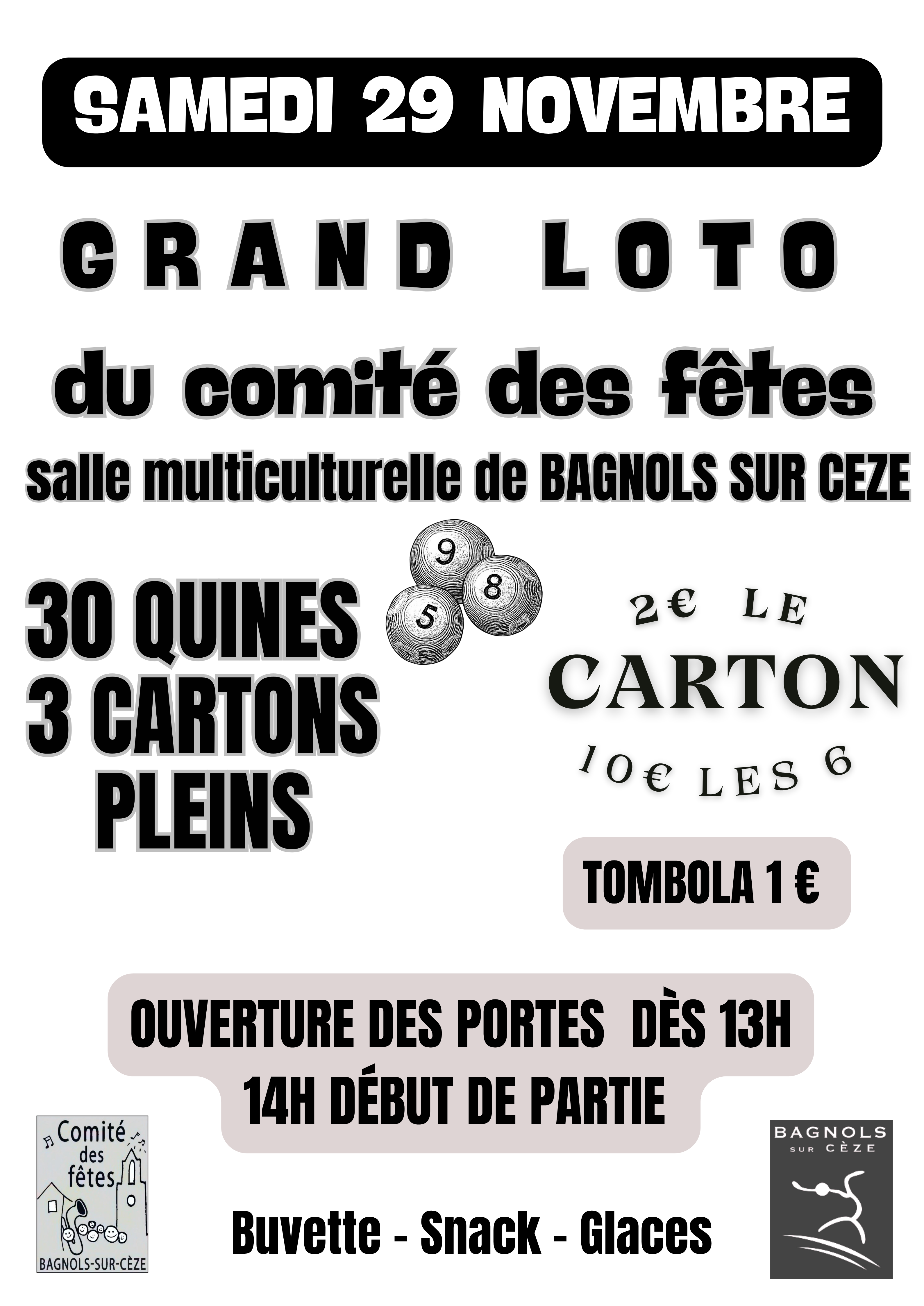 Loto organisé par le comité des fêtes de Bagnols sur Cèze avec 3 cartons pleins, 30 quines, de nombreux lots. Tombola. 2€ le carton, 10€ les 6. Tombola 1€