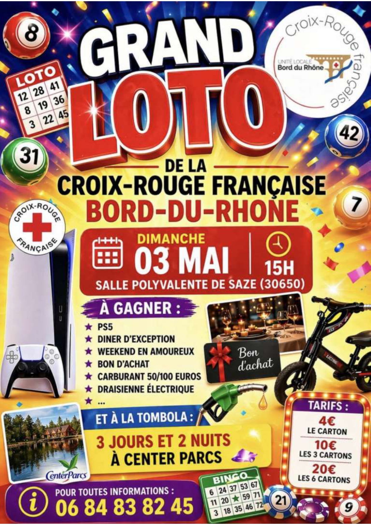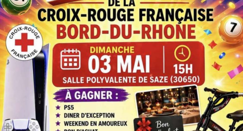 Grand loto de la Croix-Rouge française Bord-du-Rhône.Tarifs : 4 € le carton, 10 € les 3 cartons, 20 € les 6 cartons.