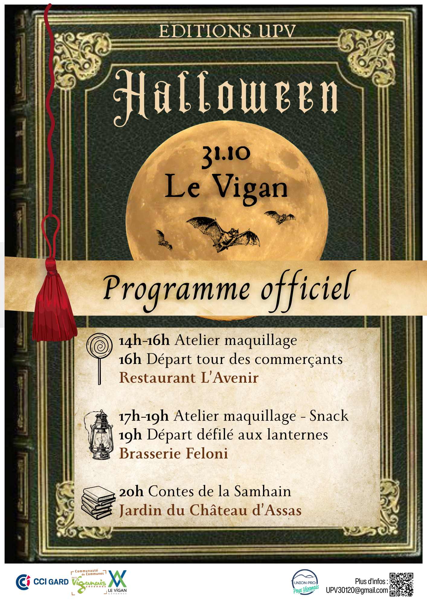 Au programme cette année : 2 ateliers de maquillages gratuits, récolte de bonbons, défilé aux lanternes et contes de la Samhain ! Plus d’infos : upv30120@gmail.com