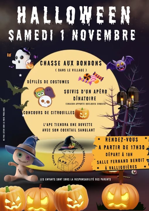 L’APE vous donne rendez-vous pour une soirée terriblement amusante ! Chasse aux bonbons, défilé de costumes, concours de la plus belle citrouille : venez nombreux passer un moment convivial, plein de rires et de frissons en famille ou entre amis !