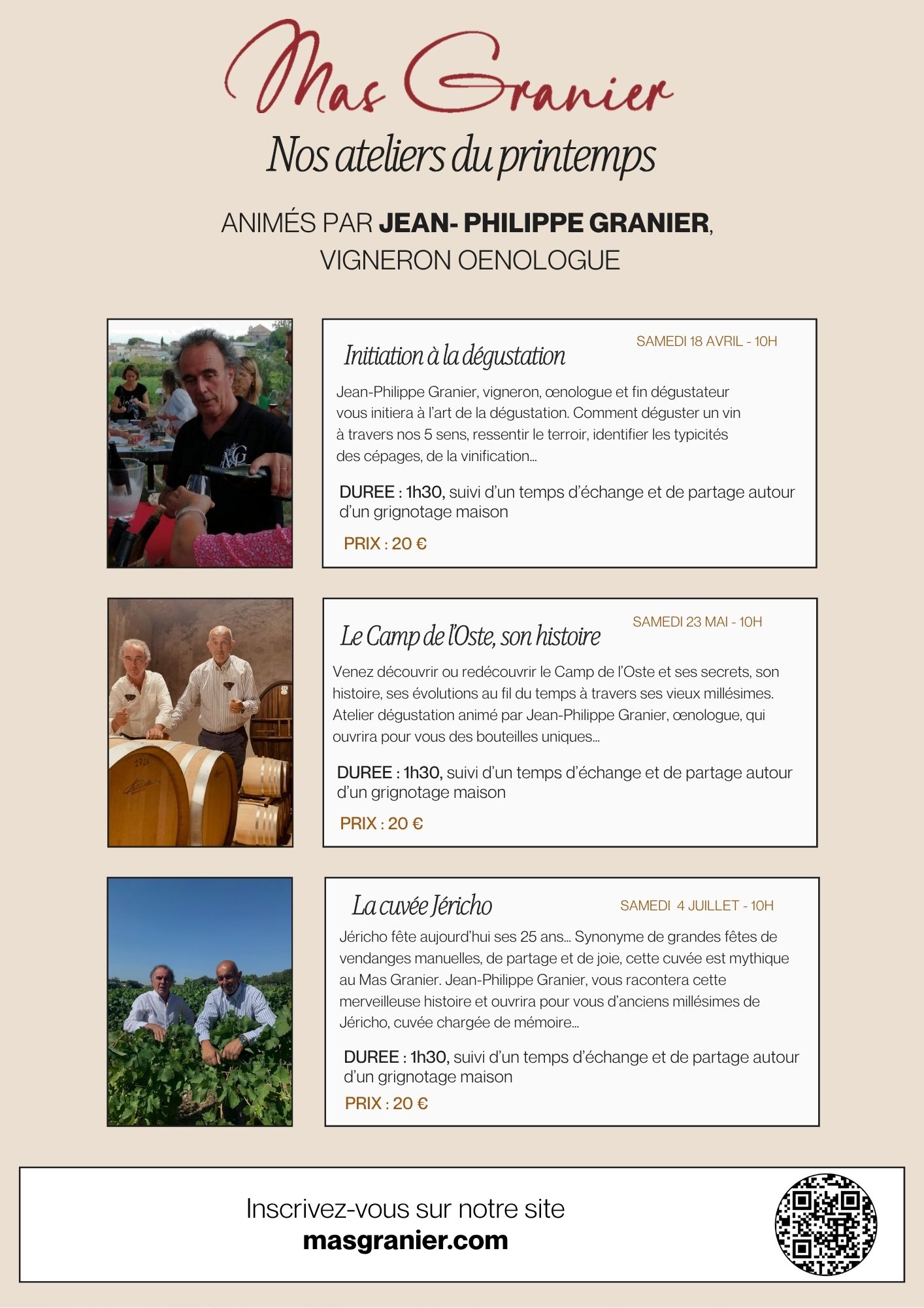 Jean-Philippe Granier, vigneron, œnologue et fin dégustateur vous initiera à l’art de la dégustation. Comment déguster un vin à travers nos 5 sens, ressentir le terroir, identifier les typicités des cépages, de la vinification…