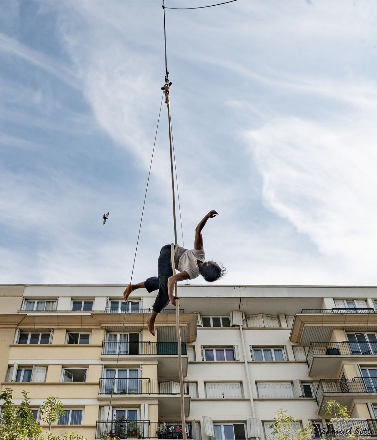 Amélie Kourim, diplômée de l’Académie Fratellini en trapèze ballant et cadre aérien, explore toutes les formes d’expression aérienne. Vous l’avez peut-être croisée devant la Cathédrale Saint-Jean d’Alès lors de Cratère Surfaces. Avec Instant, elle tisse une évolution sonore avec le violoncelliste Valentin Mussou et poétique avec les mots de Mario Collé. Une plongée verticale, une immersion perceptive pour être là, ensemble, le temps d’un instant. Ici, pas de démonstration ni d’exploit, mais une femme qui, avec tout ce qu’elle porte, se hisse à plusieurs mètres du sol pour ouvrir son regard, plus loin, plus haut. À contempler !