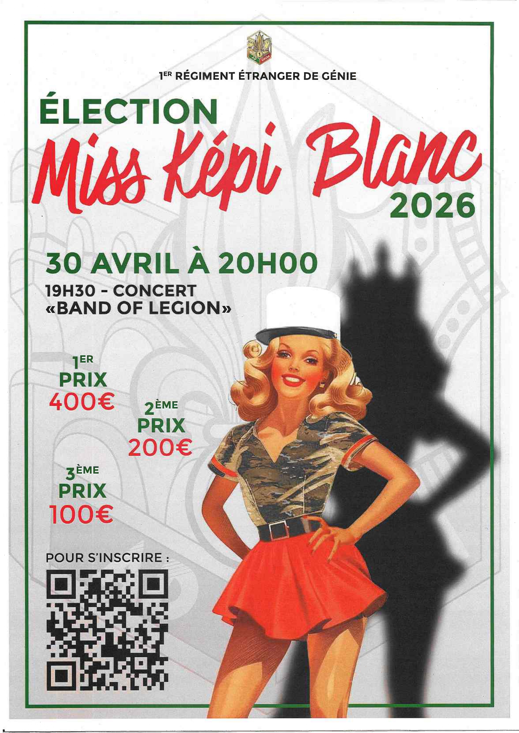 Jeudi 30 avril 9h30 : Accueil du public 10h30 : Prise d’armes 12h30 : Kermesse 20h à 02h : Élection Miss Képi Blanc et Bal du Légionnaire