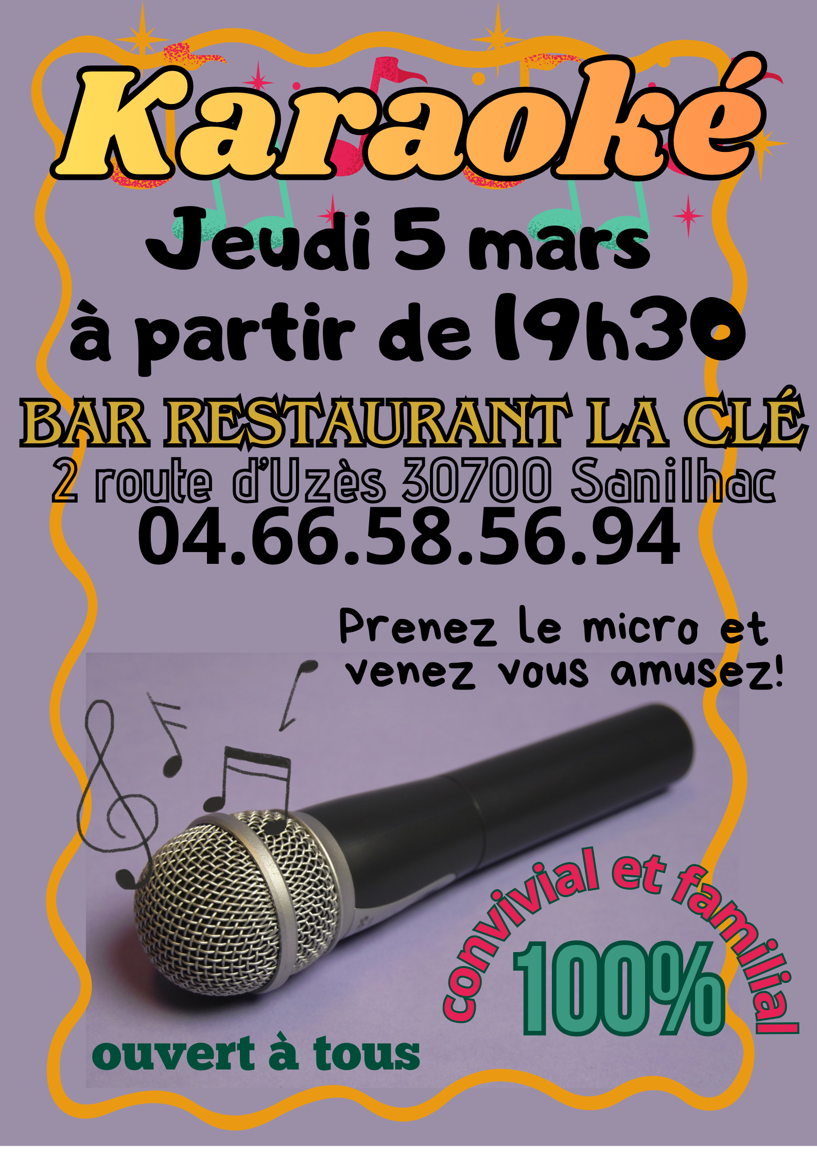 Dans une ambiance conviviale et familiale, faites-vous plaisir à chanter…. On vous laisse le micro pour une soirée, choisissez vos chansons et montez sur scène…pas de prise de tête, pas de jugement, duo improvisé et bonne humeur.