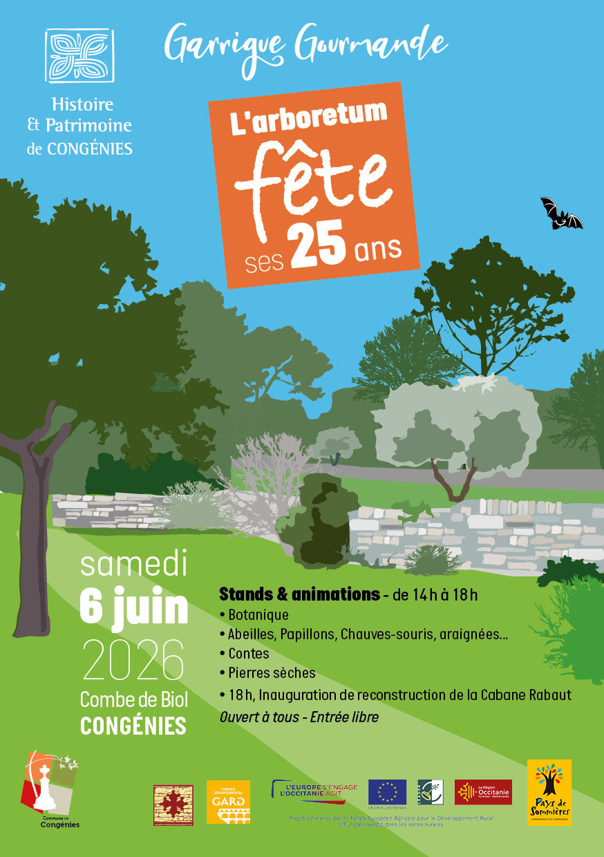 Pour fêter les 25 ans de l’arboretum de Congénies, étape du sentier de découverte Garrigue gourmande l’association Histoire et Patrimoine organise une après-midi de découverte des plantes de garrigue ainsi que différentes activités pour évoquer la biodiversité de ce milieu, oiseaux, papillons, araignées, chauve-souris.
