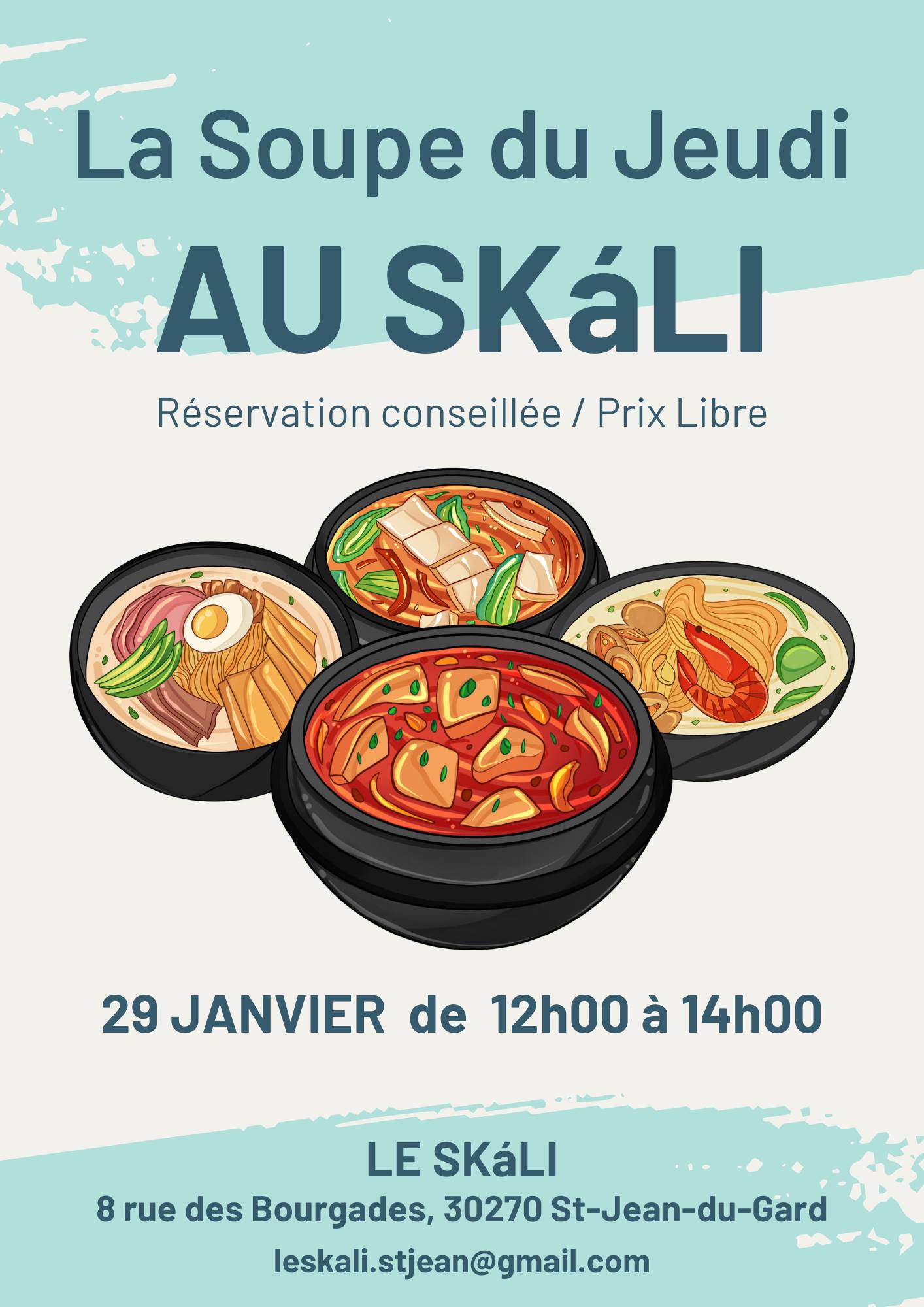 La soupe du jeudi revient en 2026 ! La formule comprend toujours soupe et pain à volonté + dessert, le tout maison et bio, à prix libre et… c’est vraiment succulent !Au plaisir de vous retrouver pour partager ce moment !