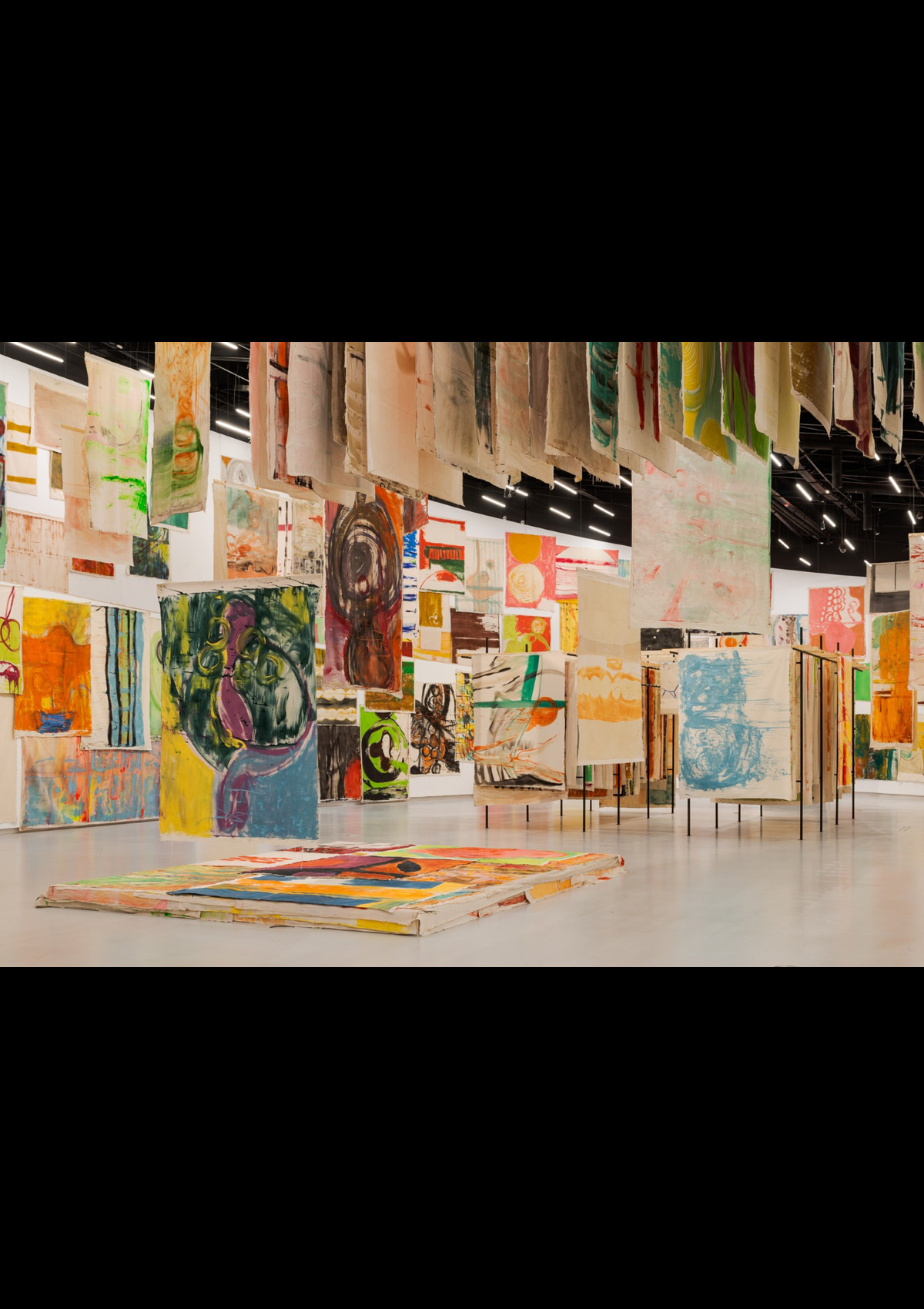 Vivian Suter travaille quotidiennement dans son jardin de Panajachel au Guatemala, où elle vit depuis les années 1980. Elle laisse ses toiles au dehors et intègre dans sa peinture les facteurs externes tels que l’humidité, la lumière, la flore et la faune constituant ainsi une documentation de son environnement de vie. Les forces et les textures de la luxuriante nature subtropicale sont enregistrées dans la peinture gestuelle et colorée de l’artiste. Près de 400 œuvres réalisées ces dernières années sont réagencées de manière libre et spontanée en dialogue avec l’architecture de Norman Foster.