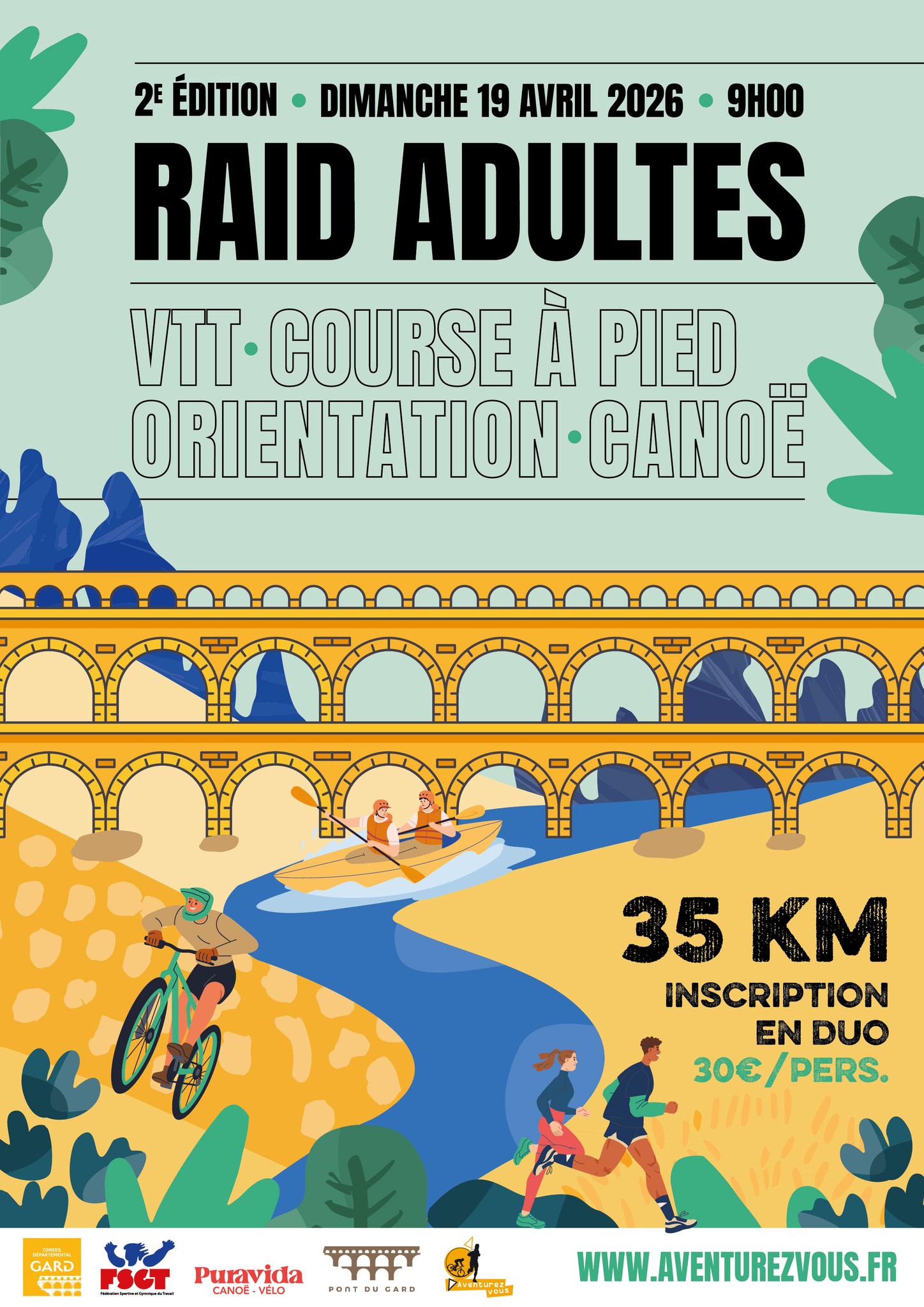 Retrouvez la 12ème édition du raid des enfants au Pont du Gard. Au programme du canoë, de l’orientation, du VTT et de la course à pied. Deux formules vous sont proposées : le grand Raid ou le petit Raid.2 raids / 2 distances adaptées à la tranche d’âge.