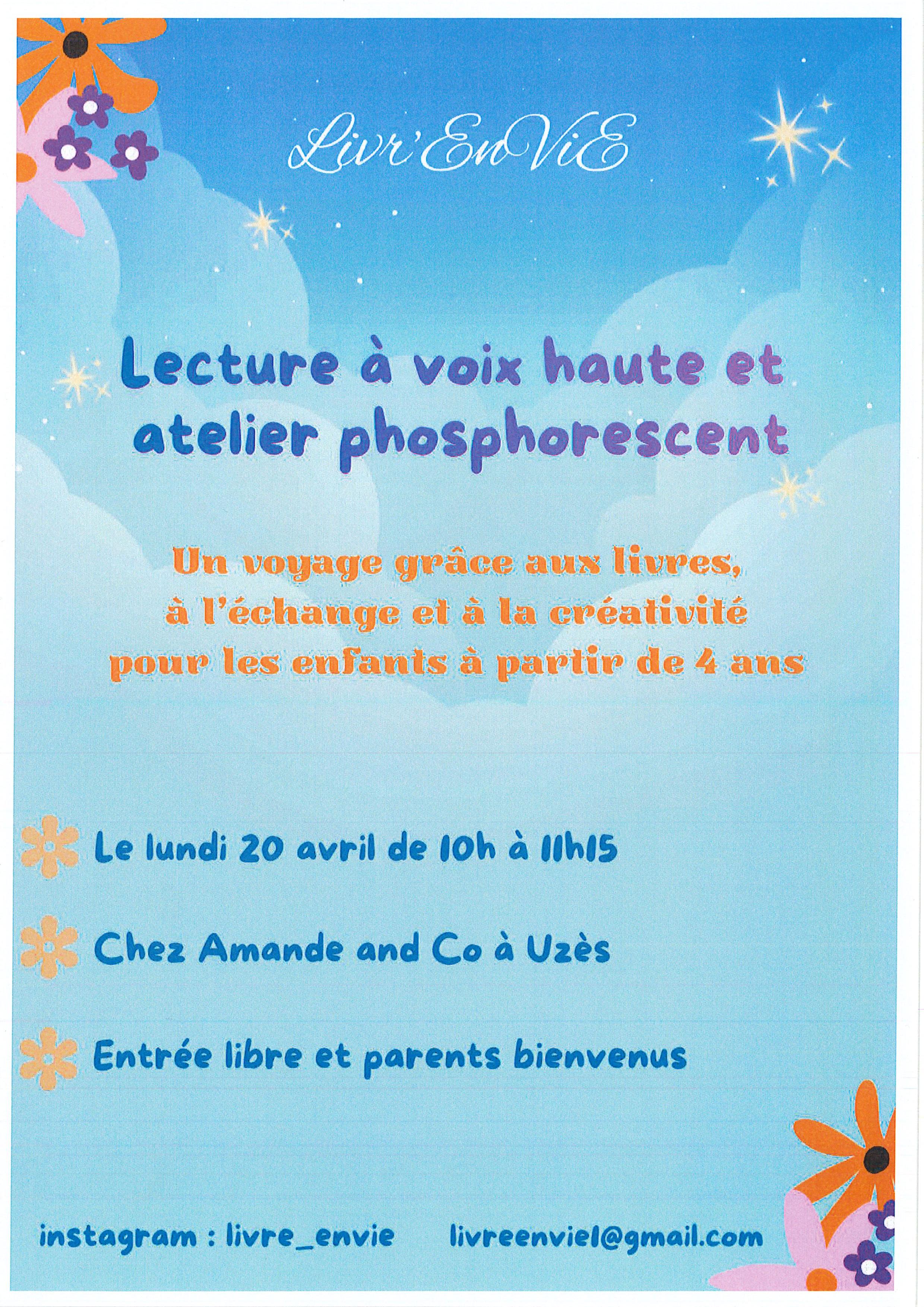 Livr’EnVie propose un atelier pour les enfants à partir de 4 ans pour découvrir le livre autrement. Lecture à voix haute d’un album jeunesse, échange et création (dessin, gommettes, tampons…). Le tout avec beaucoup de phosphorescence !
