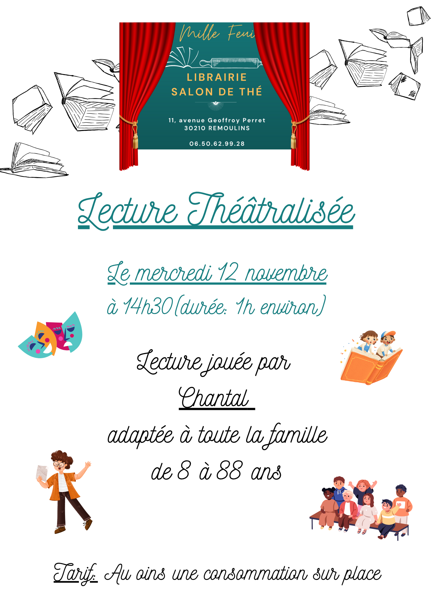 Le temps d’une heure, venez écouter une lecture théâtralisée et profiter du salon de thé. Chantal nous lira un conte théâtral adapté à toute la famille. Chaque mot prend du sens, chaque personnage devient réel.